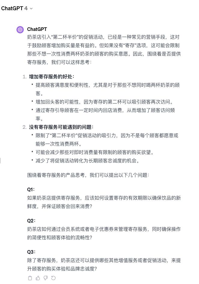 以下是GPT对于奶茶店能否用寄存策略、以及为什么不用这一策略,展开的产品思考