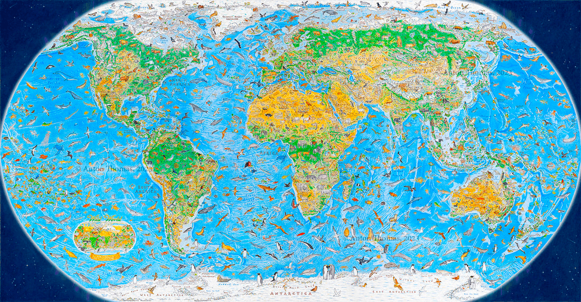 Wild World 是由制图师 Anton Thomas 手绘创作的新地图,专注于自然世界,是对地球自然地理的生动描绘。这张地图历时 3 年绘制完成,使用彩色铅笔和钢笔手绘,其中有 1642 种动物在丛林、沙漠和海洋中漫游。
