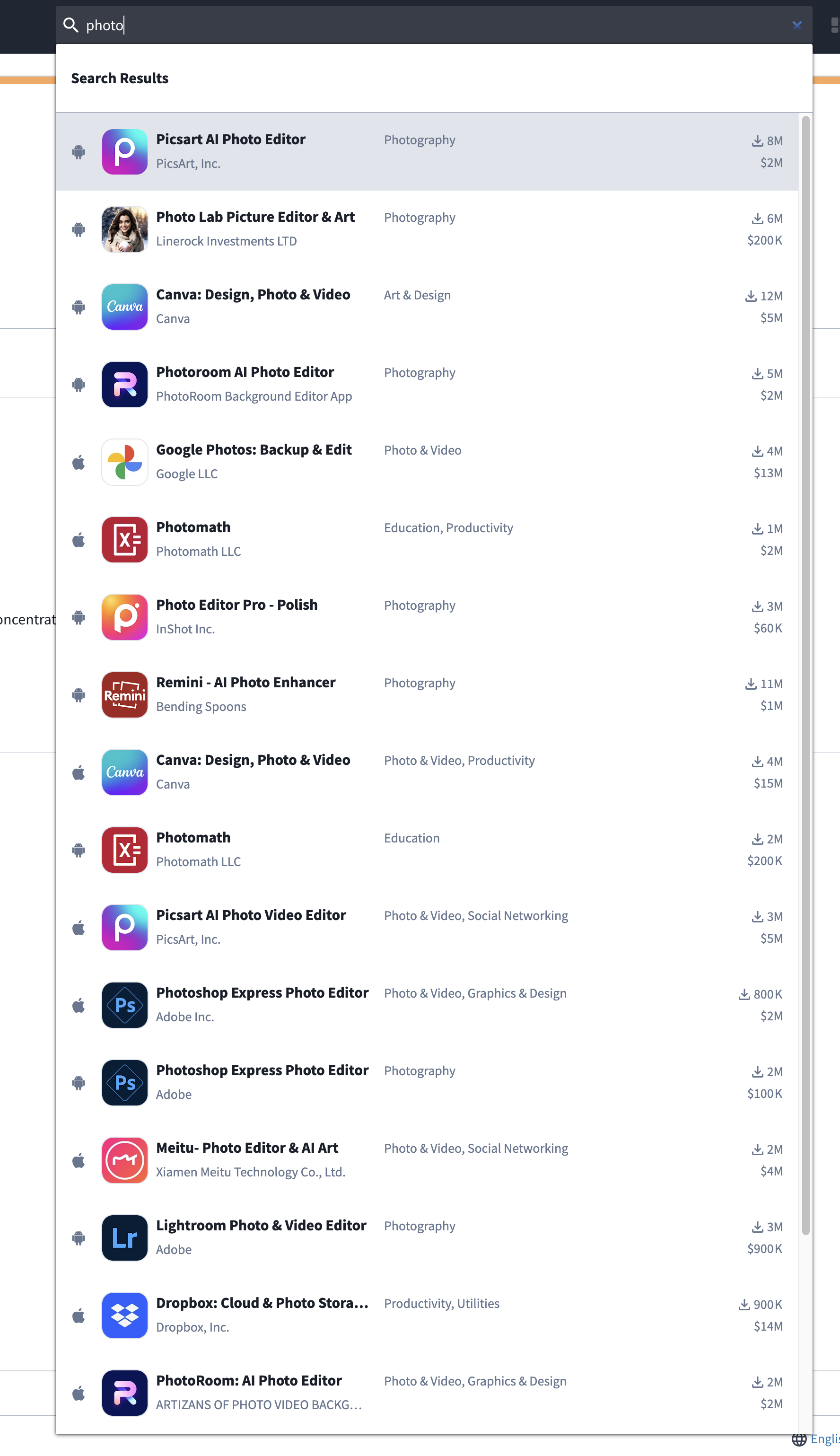 右侧会出来两个数字,带下载图标的是估算的每月下载量,下面带美元符号的是估算的每月收入。