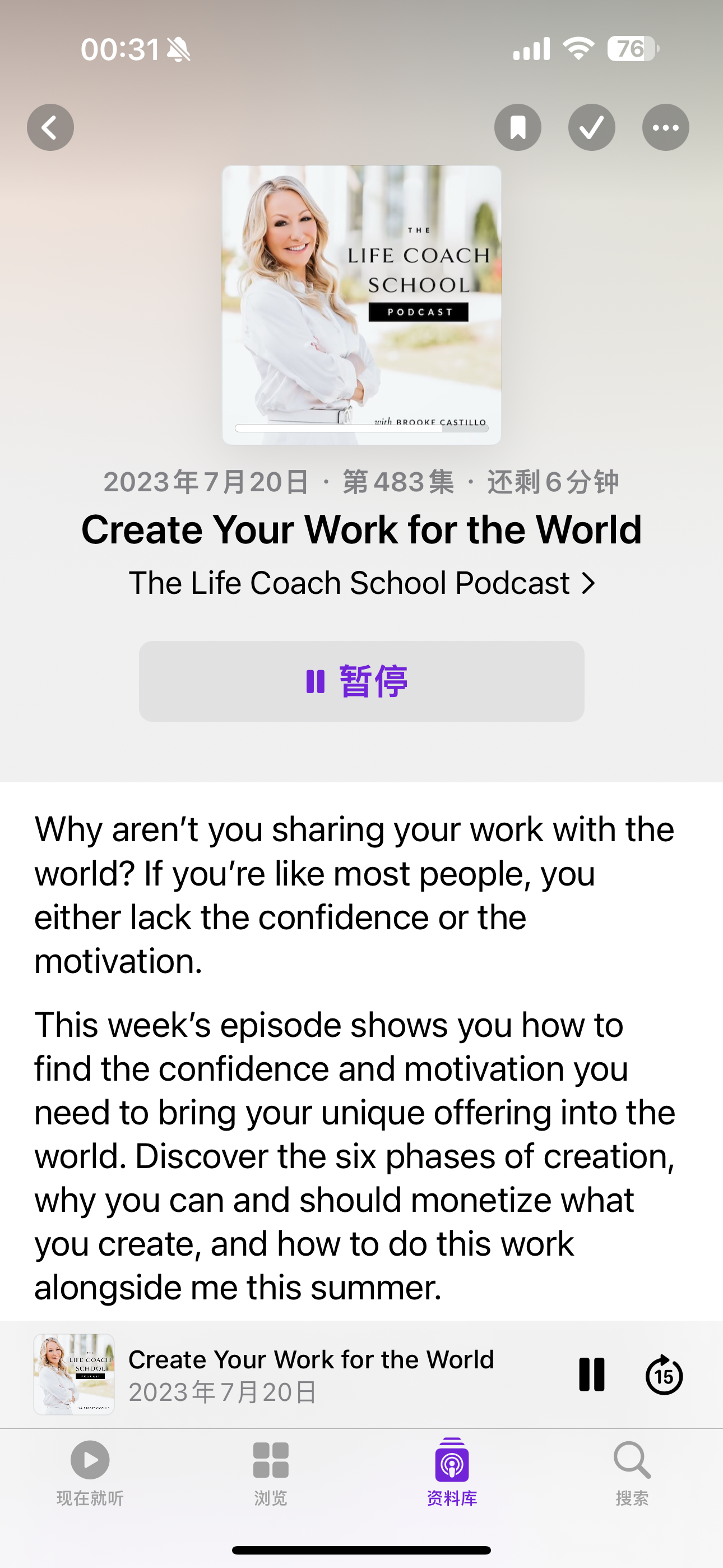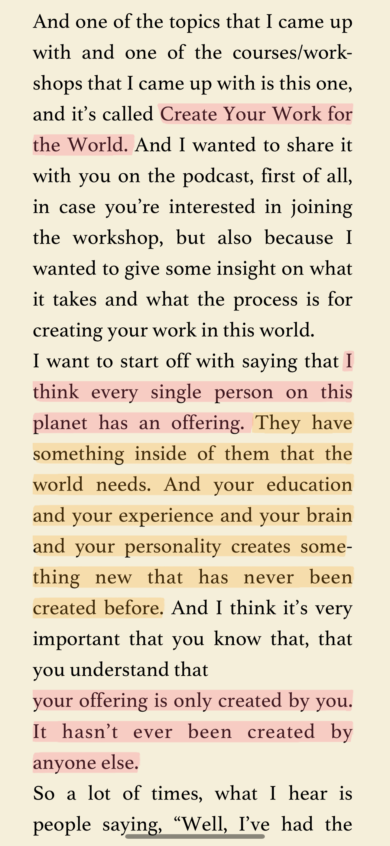 周末做午饭的时候听了一期播客Create Your Work for the World (为世界创造你的作品)。如果你想要做出一个决定,内心又有犹豫和阻碍;又或者你有向世界表达自己的渴望,却因担心自己提供的东西不够有价值而停滞不前时,可以听听看。