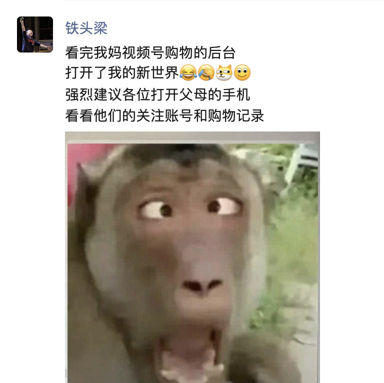 铁头梁发这种朋友圈真的太 tm 搞笑了,自己就是蹭风口搞投放在视频号里卖货的,我上 641 线下课的时候,讲了特别多的短视频骚招,比如什么找老头老太太当演员卖惨卖橘子啥的…