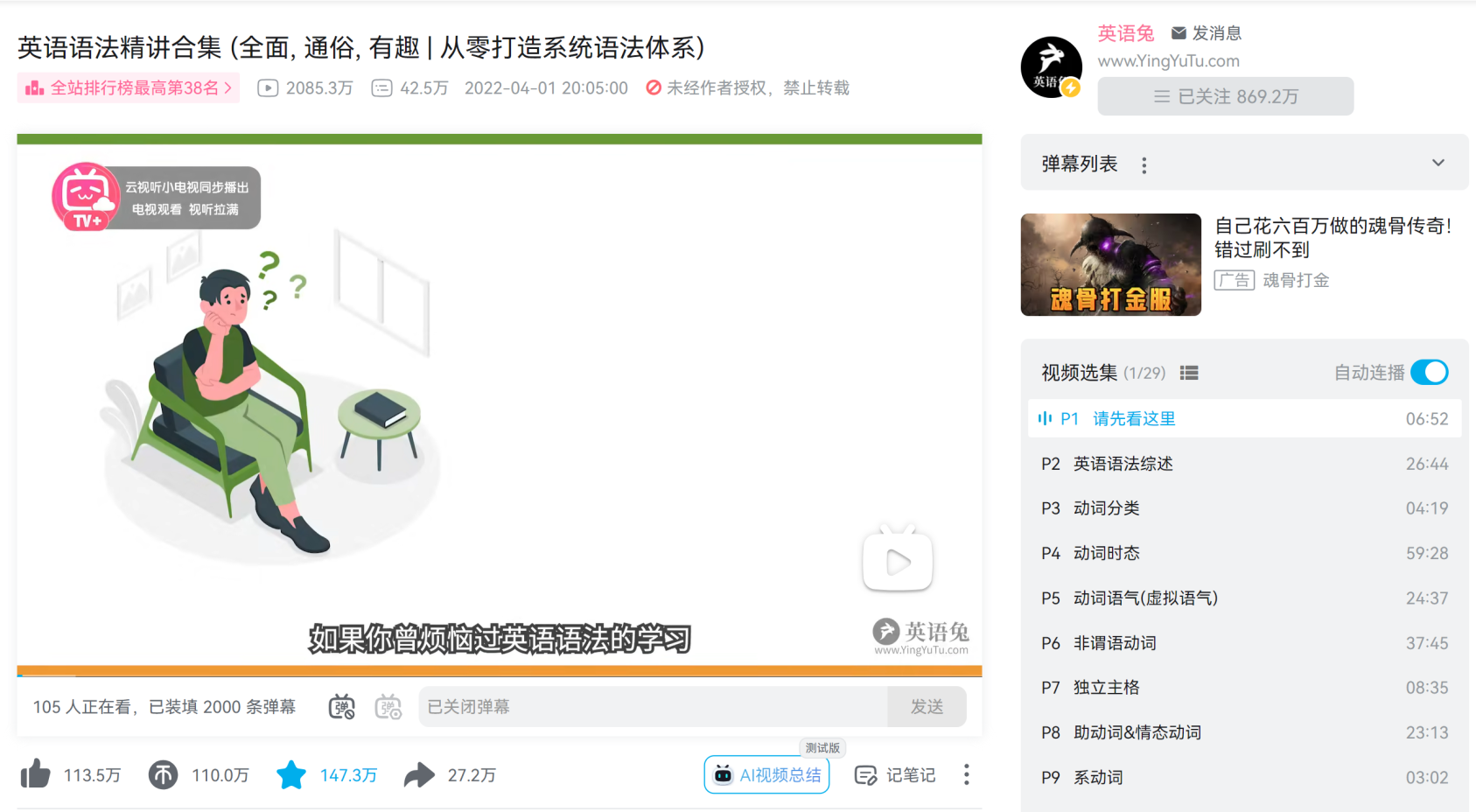 我最喜欢的是这门课,看完这门课基本就可以牢牢地搭建出你的语法框架,理论知识绝对的扎实,看完之后很多以前看不懂的句子都能看懂了,后面只需要不断地阅读实践就可以,不需要再去看什么晦涩的语法书。