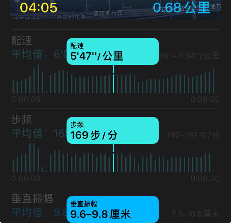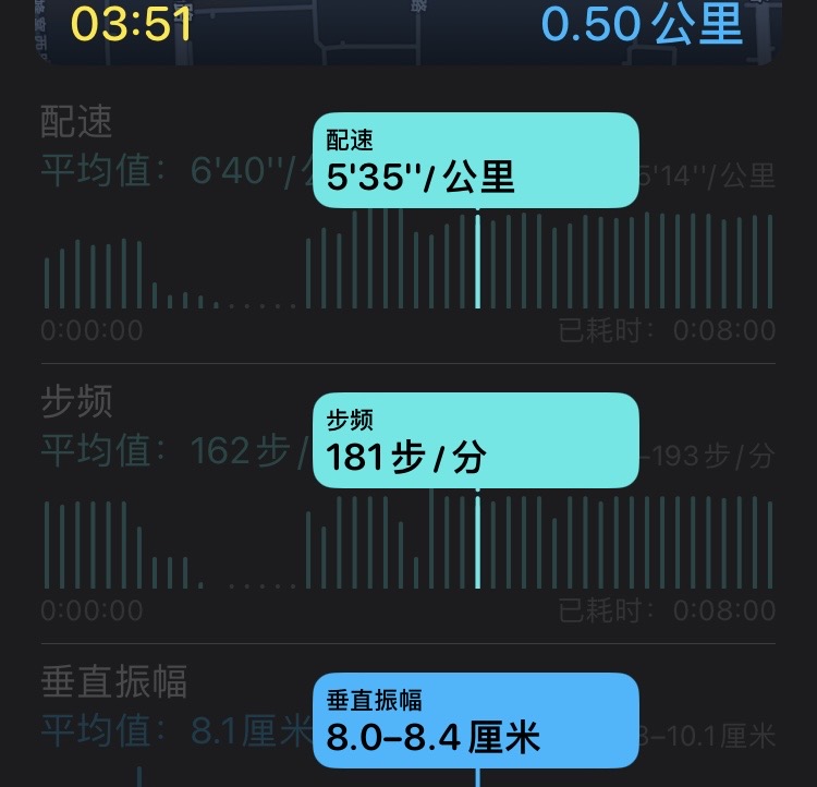 在意识改善跑姿后,我看了下自己的跑姿数据,垂直振幅明显下降,从9.6-9.8厘米下降到8.0-8.4厘米,步频也有所提高,从 169 提高到 181。