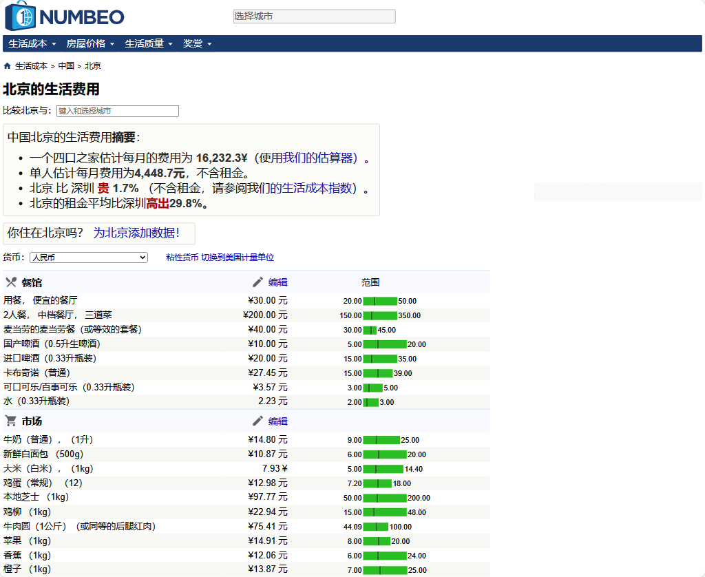 Numbeo 是一个全球生活成本的数据库,它提供了全球包括住房、餐馆、交通等数据,足够准确且实时更新。