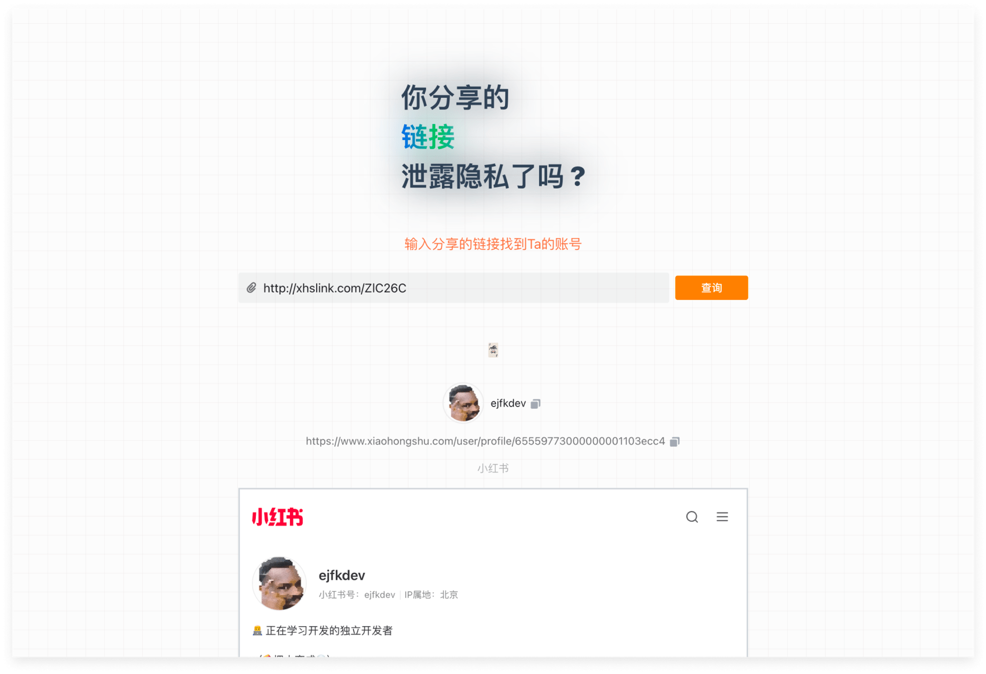 大多数应用在分享链接中植入参数使用了身份追踪技术,从而猜测你与点开链接人的社交关系,对你和你认识的人进行个性化推荐和精准广告推送。陌生人可以通过你分享的链接获取你的社交账号再进一步了解个人信息。这个网站可以粘贴分享的链接,识别链接是否会泄露隐私,并展示泄露的社交账号。