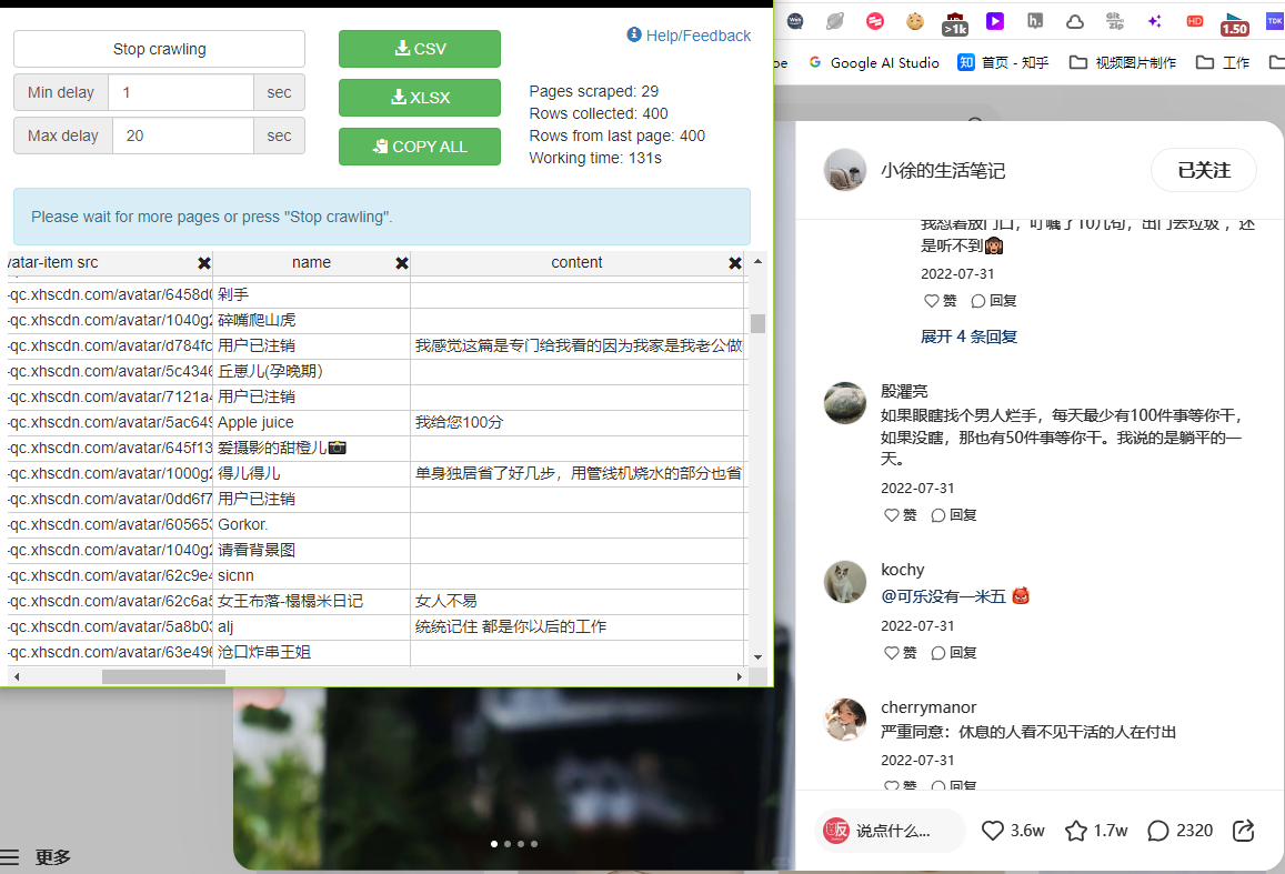 分享一个chrome浏览器的 爬虫插件,用来爬小红书帖子的评论区非常好用,也可以爬博主主页帖子,插件名字叫做“Instant Data Scraper”