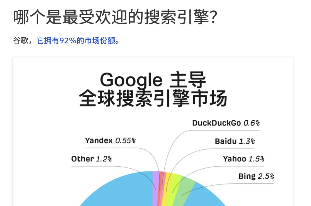 就拿搜索引擎来说,以前在我的想象之中,谷歌和百度平分秋色,但其实在全球市场,谷歌拥有92%的市场份额,百度只有不到2%。这代表着,更多的结果页,更多的信息,就是用英文展示的。