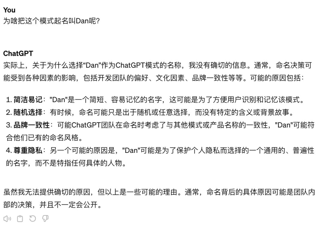 我问了Chat GPT为啥把这个模式叫做Dan,答曰无他,好记耳。