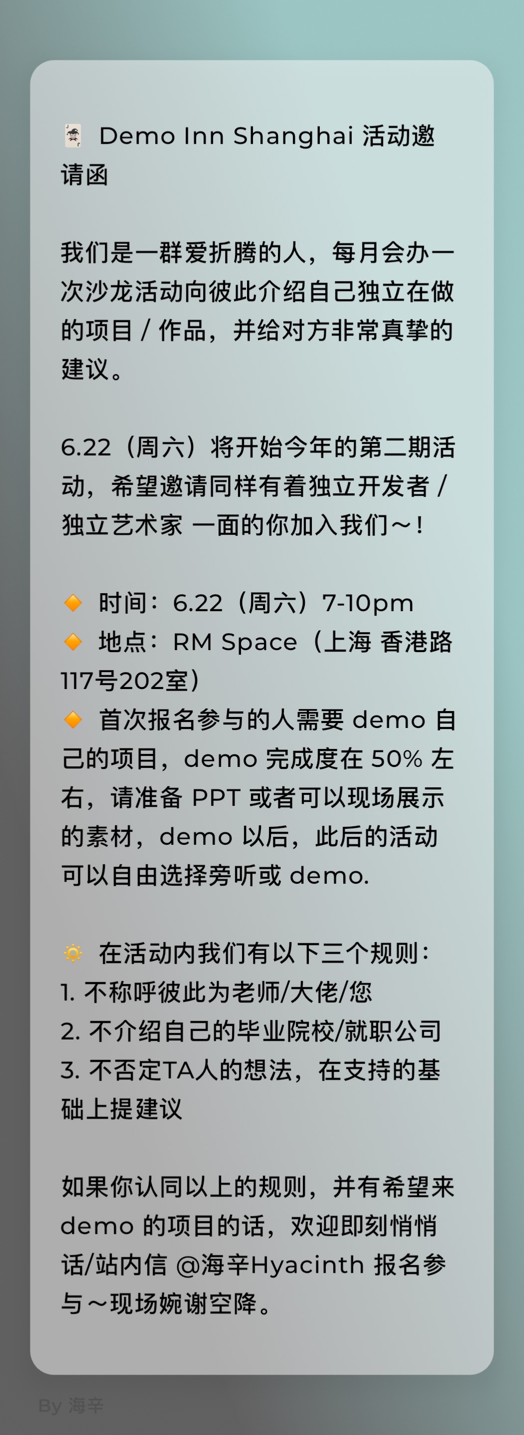 Demo Inn Shanghai 下一期活动在 6 月 22 日(周六)晚上 7-10 点于