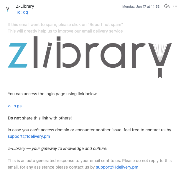 你给他发任意一封邮件,一分钟之后他会自动回复一个地址,然后你就可以登录Z-Library了