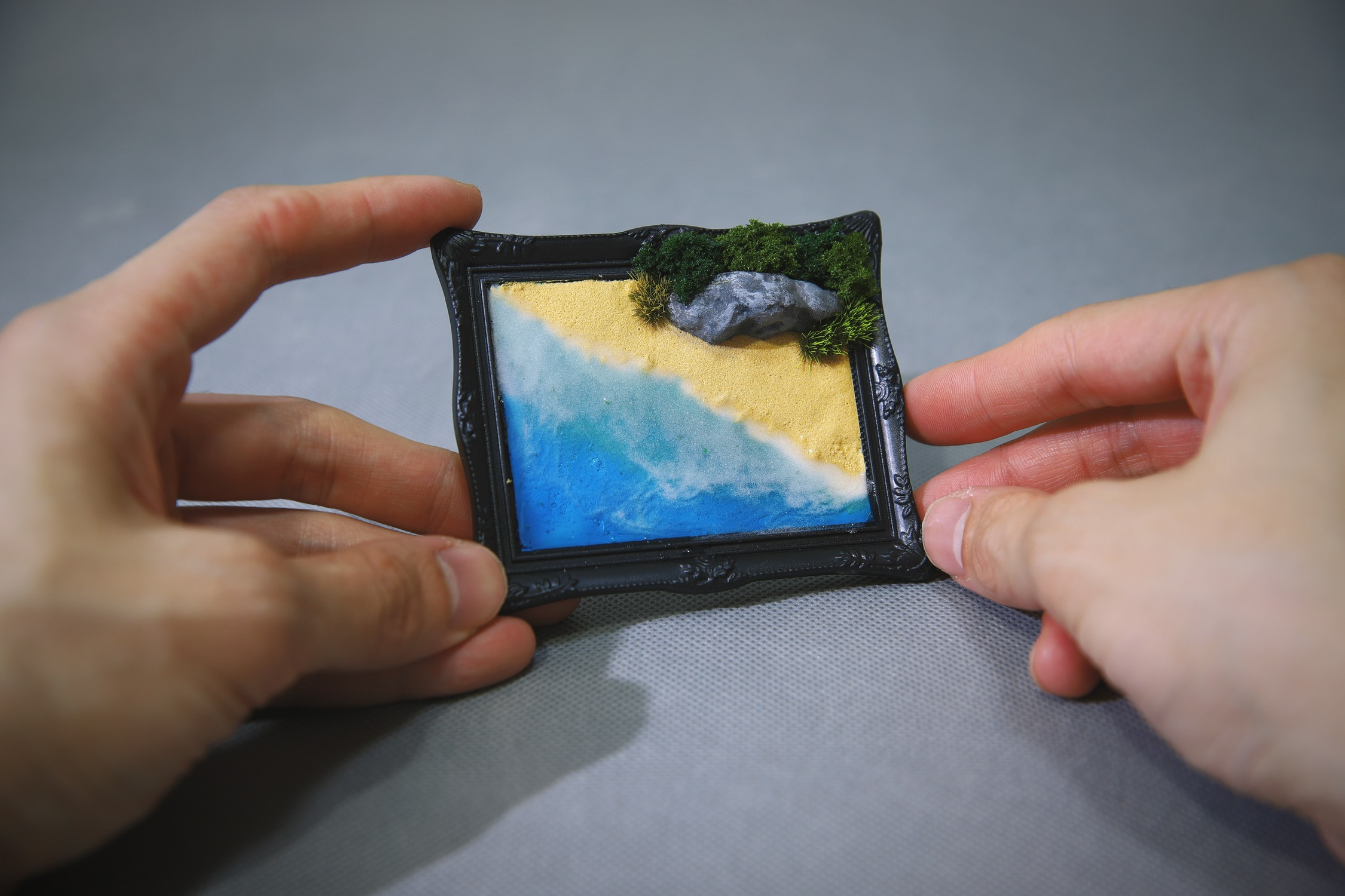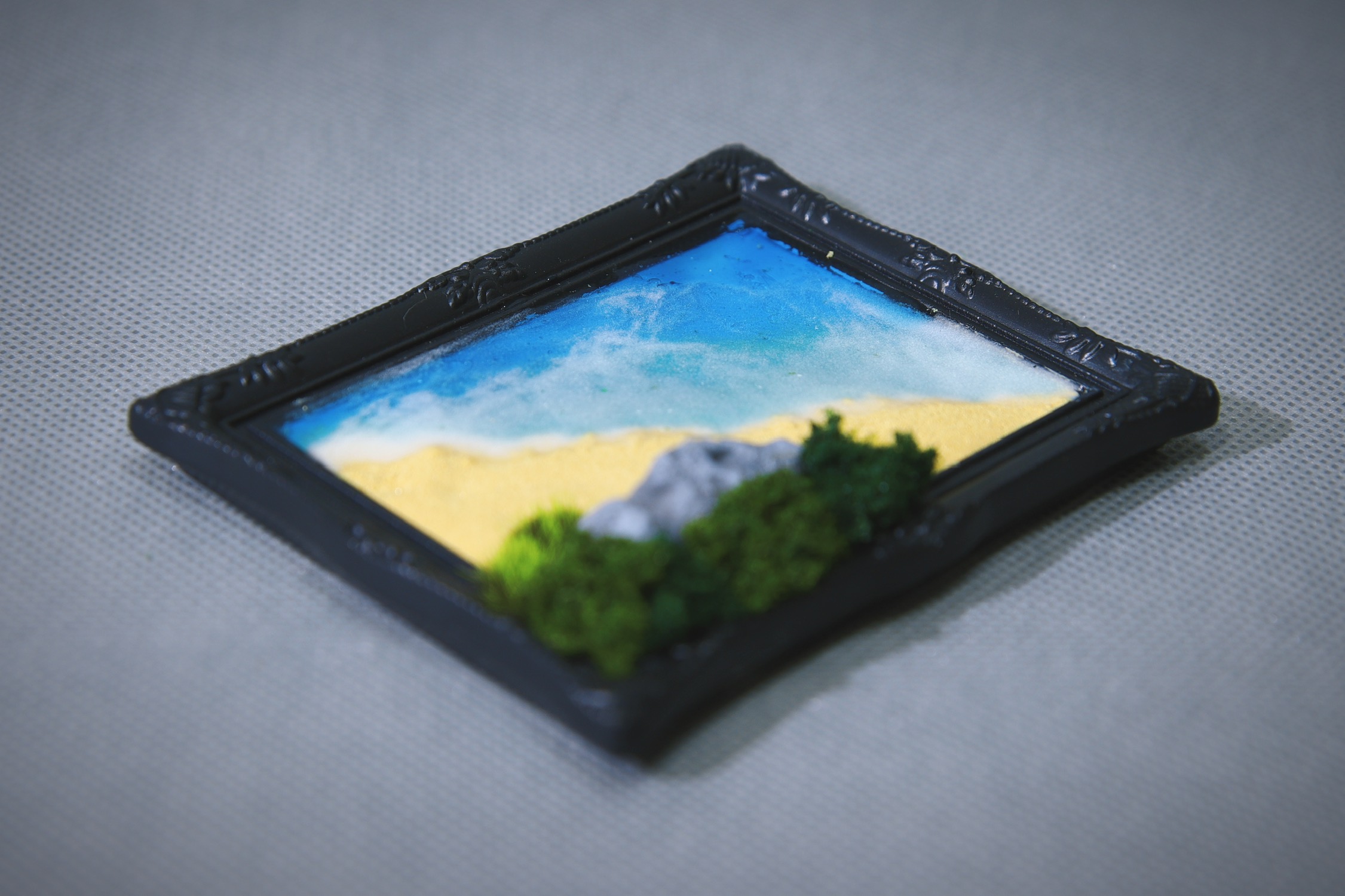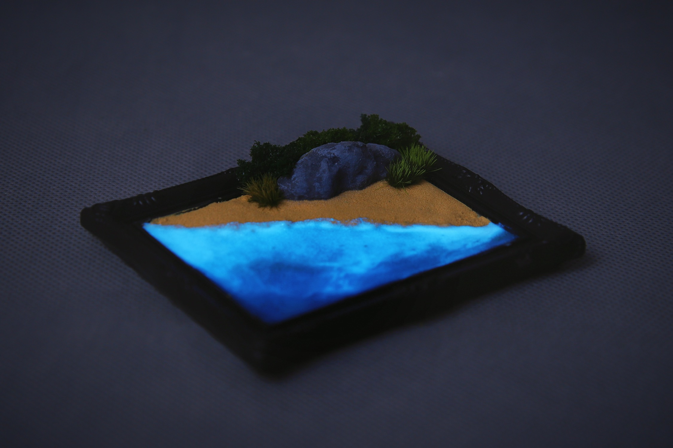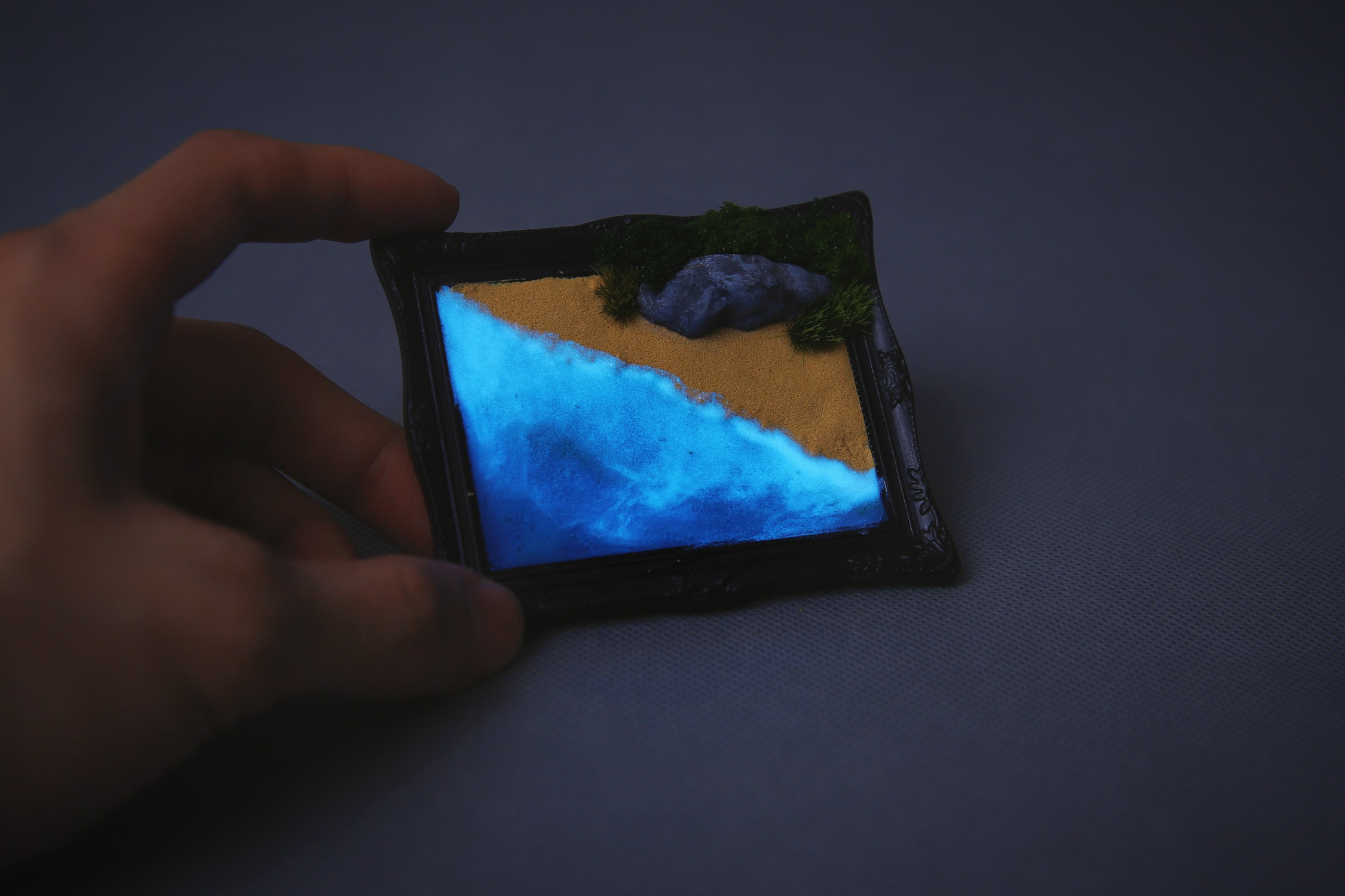 这是一个微缩景观冰箱贴,纯手工制作的蓝眼泪沙滩,所使用的夜光材料能让海浪在黑暗环境下散发淡蓝的微光。目前制作的两个不算完美,但大体上已经达到我的预期,于是决定通过抽奖的方式送给今天之前关注我的即友~(邮费自理噢!)