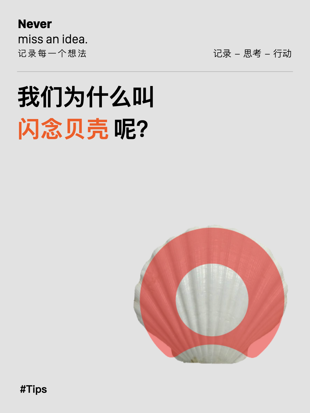 闪念贝壳的名字是这样来的:你的想法就像进入贝壳中的沙粒,不断被打磨,最终变成璀璨的珍珠。你的每一个灵感和想法都值得成为珍珠。