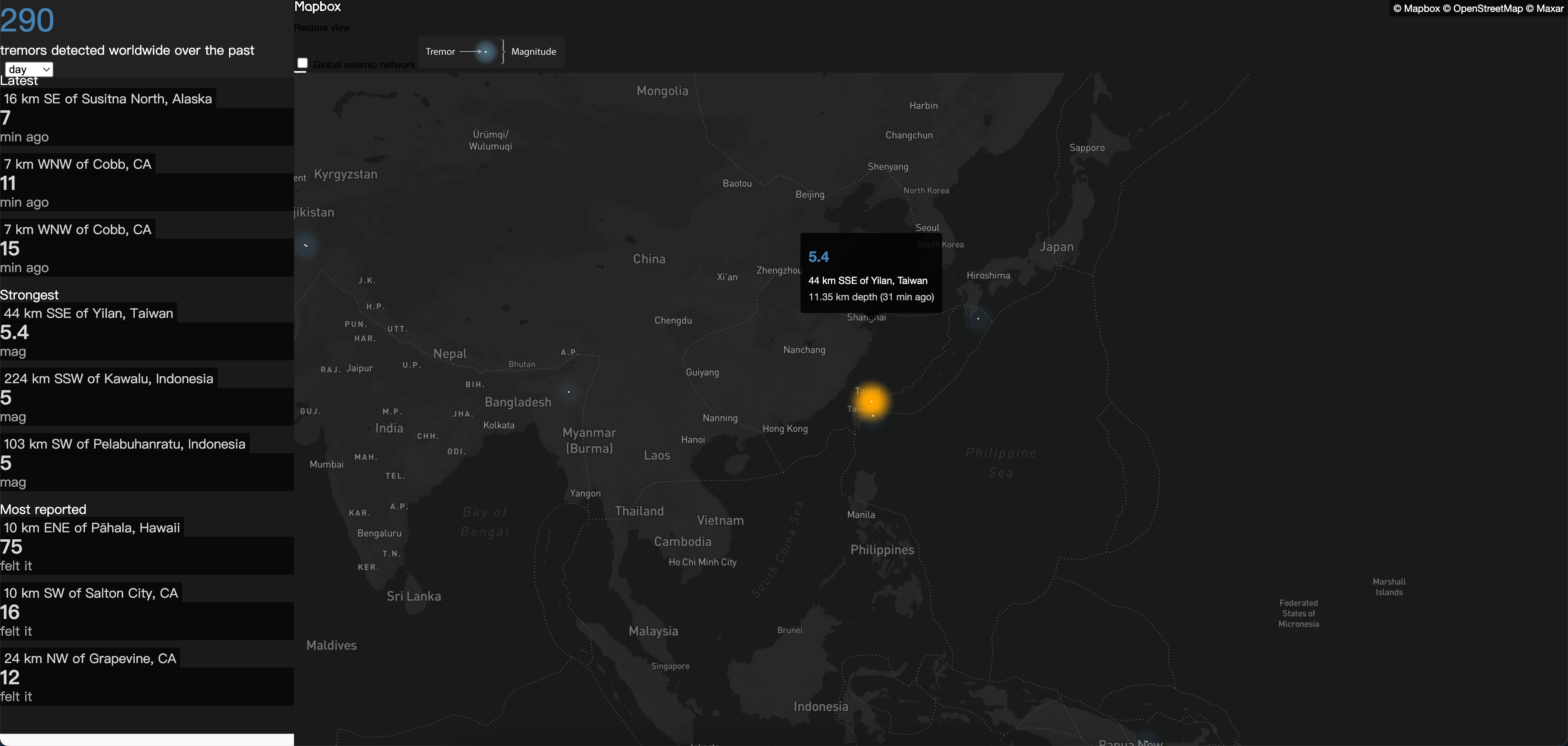 这个网站可以实时监测全球地震,其实它是一个mapbox地图的官方示例,但是数据更新还挺及时的,刚刚台湾附近发生的地震也监测到了。