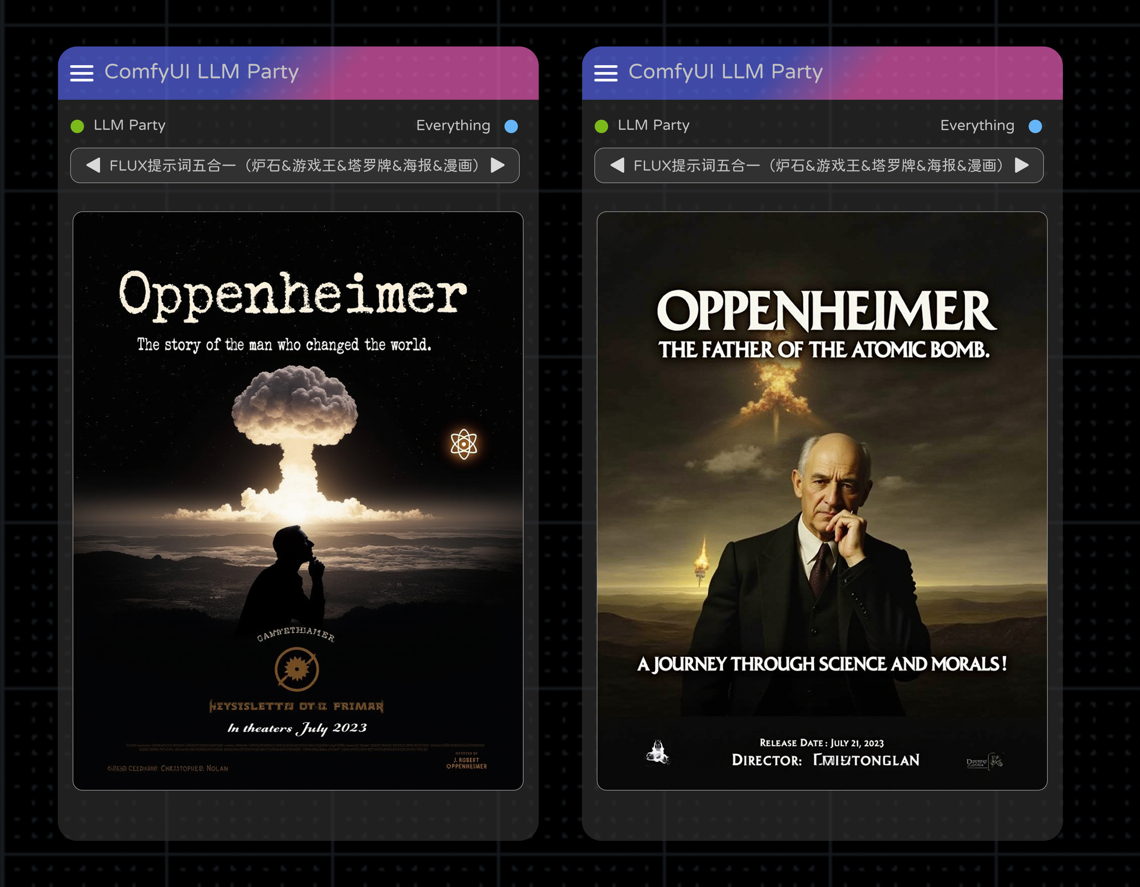 🧐这个工作流是专门为 FLUX 模型用户设计的,它通过 ComfyUI LLM Party 插件自动生成适用于不同场景的提示词。预设了五种模板,包括海报(Poster)、炉石传说(HearthStone)、游戏王(Yu-Gi-Oh)、塔罗牌(Tarot)和漫画(Manga),用户可以根据自己的喜好和使用需求,选择合适的模板生成对应的图像内容。