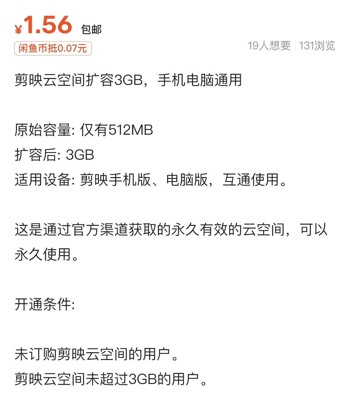 【事业】分享一个小技巧!剪映app有一个云空间,如果是扩容的话,好像是一个月六块钱。但如果是轻度用户,可以在闲鱼上搜索【剪映扩容】,1.5元可以获得永久的3GB空间。