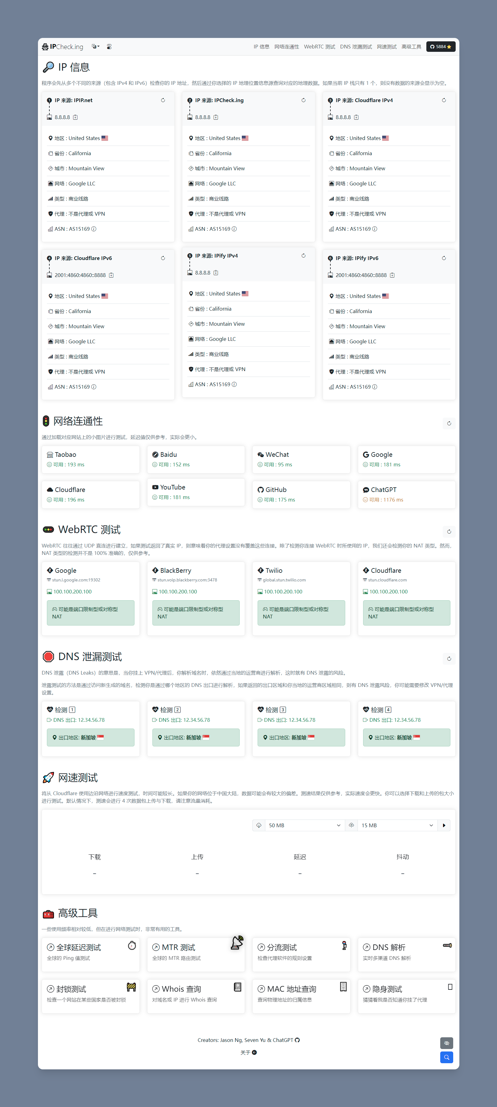 IPCheck.ing 是一个免费的 IP 工具箱,功能非常全面: