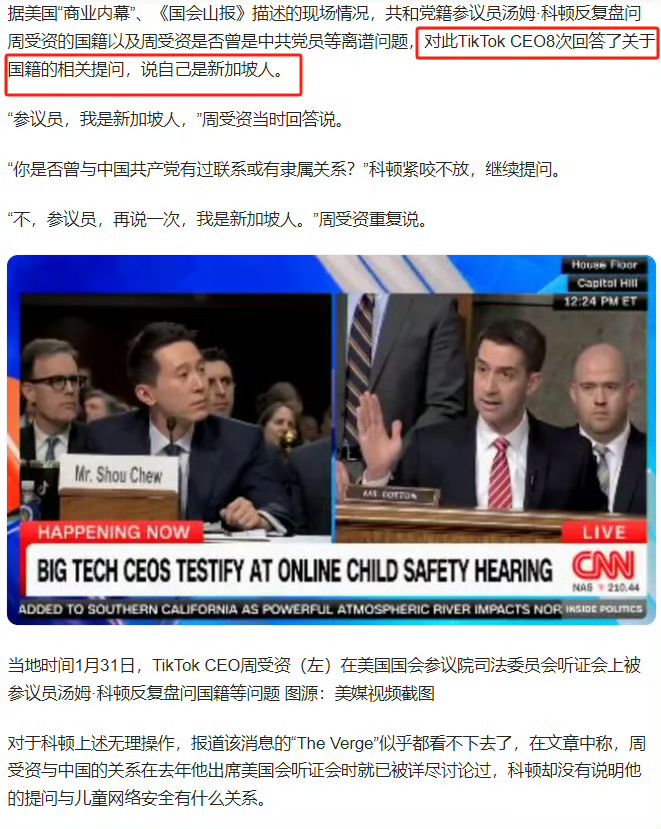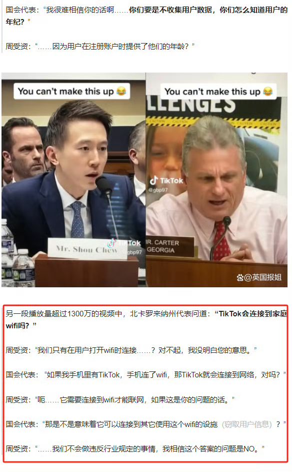 去年tiktok的CEO周受资在美国会做听证时,一些美国议员的问题非常反智和无脑。并非那群国会老爷们蠢笨,而是他们的支持人-相当部分的美国民众爱听,比如问: