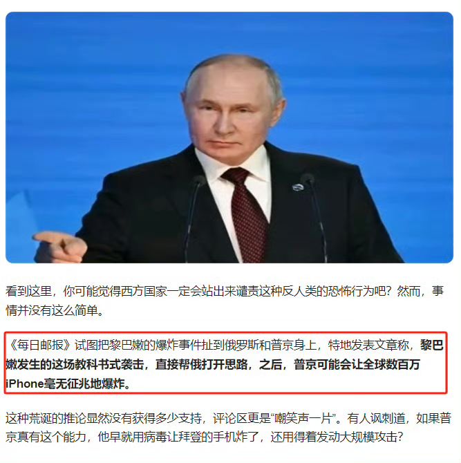 苹果手机会爆炸最初的谣言,来自于英国《每日邮报》,原文是“黎巴嫩发生的这场教科书式袭击,帮俄打开思路,之后普京可能让全球数百万iPhone毫无征兆地爆炸。”