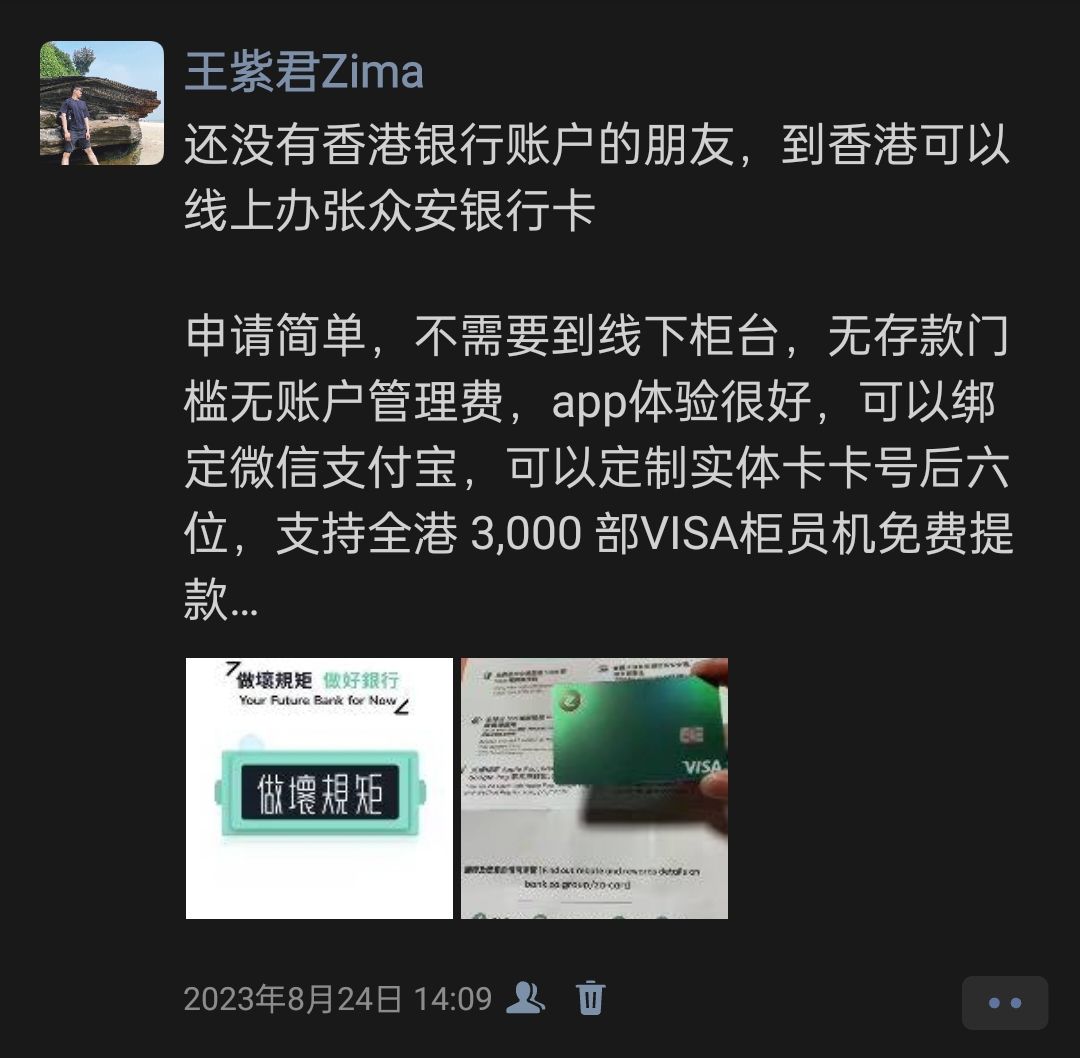申请简单,不需要到线下柜台,无存款门槛无账户管理费,app体验很好,可以绑定微信支付宝,可以定制实体卡卡号后六位,支持全港 3,000 部VISA柜员机免费提款…