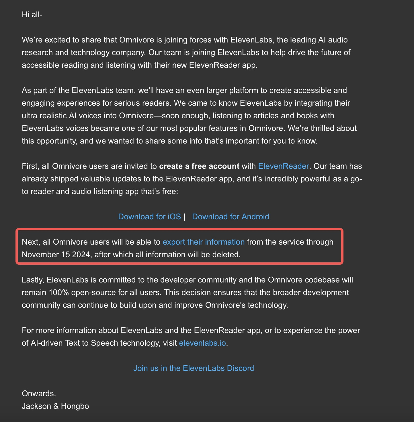 免费的稍后阅读工具 Omnivore 被 Elevenlabs 收购后即将停服。 用户需在 11 月 15 日前导出自己的数据。
