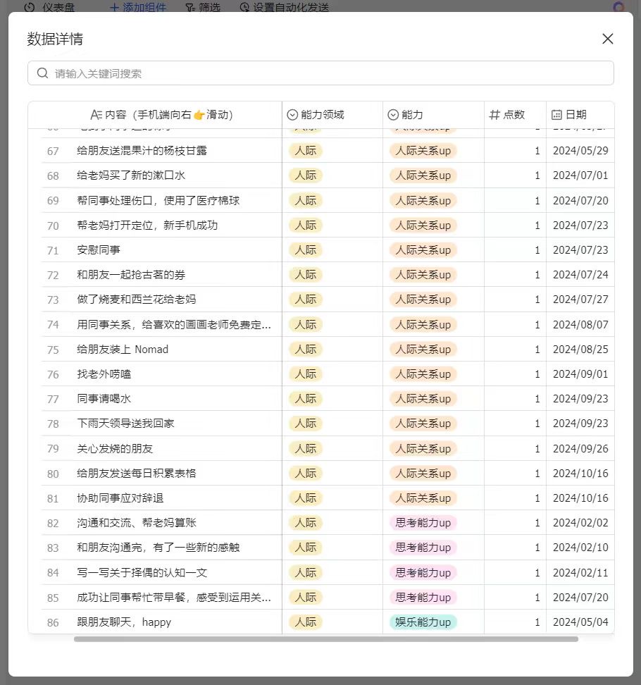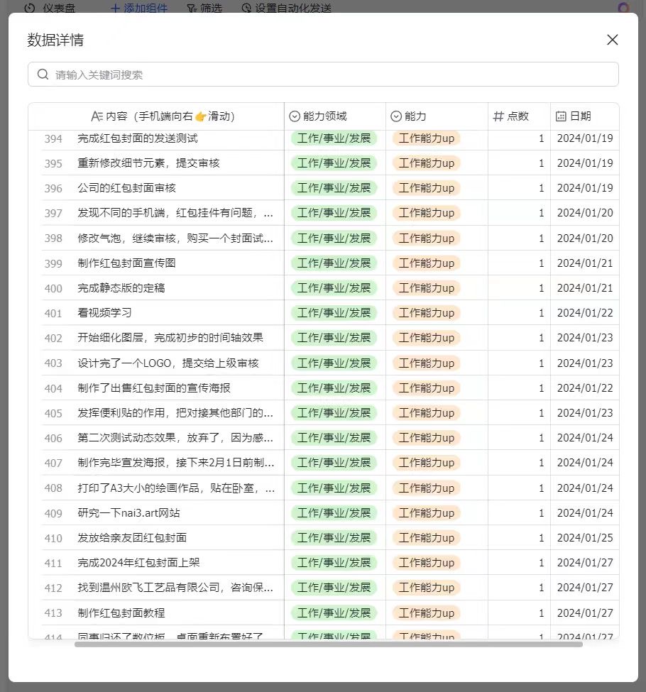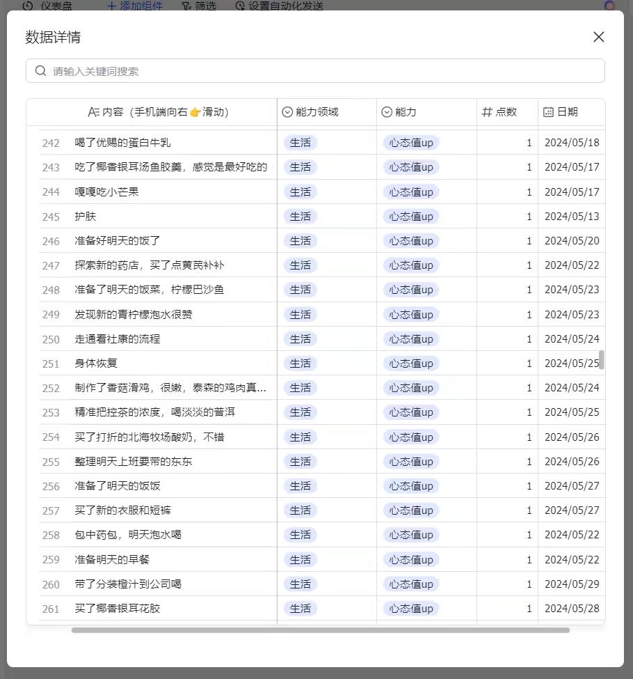 年底基本上就不记得了•ᴗ•💧,表格是一个很好的记录方式,让我有一种今年没有白过的感觉,多维表格的仪表盘也可以看到各个领域的百分比,很具体。