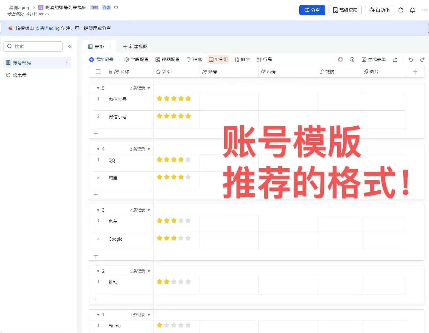 s04gkxl3xxp.feishu.cn6️⃣ 还有一个特别好用的,是账号多维表格模板,也推荐一下:(解决了很多次我找不到账号的问题🫠,找不到会急死人的……之前记录的备忘录后面内容太杂,没有多维表格顺手和整洁):