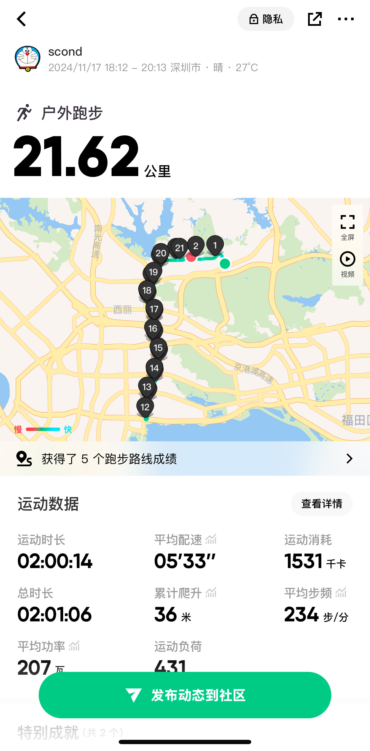 前半程12km 跑到了海边,后半程往回跑,发现月亮很圆,挂在天边,于是一边听着播客,一边追着月亮跑。今天一路上什么都没想,沿着河边一直往前跑,竟然一次放弃的念头都没有,最后半段每跑完 1km,都默默给自己鼓掌一次,到了 21km 的时候,感觉要自由飞翔了,好像比赛要冲破终点线了,但是最后却没有兴奋也没有激动,淡定的按下了结束键