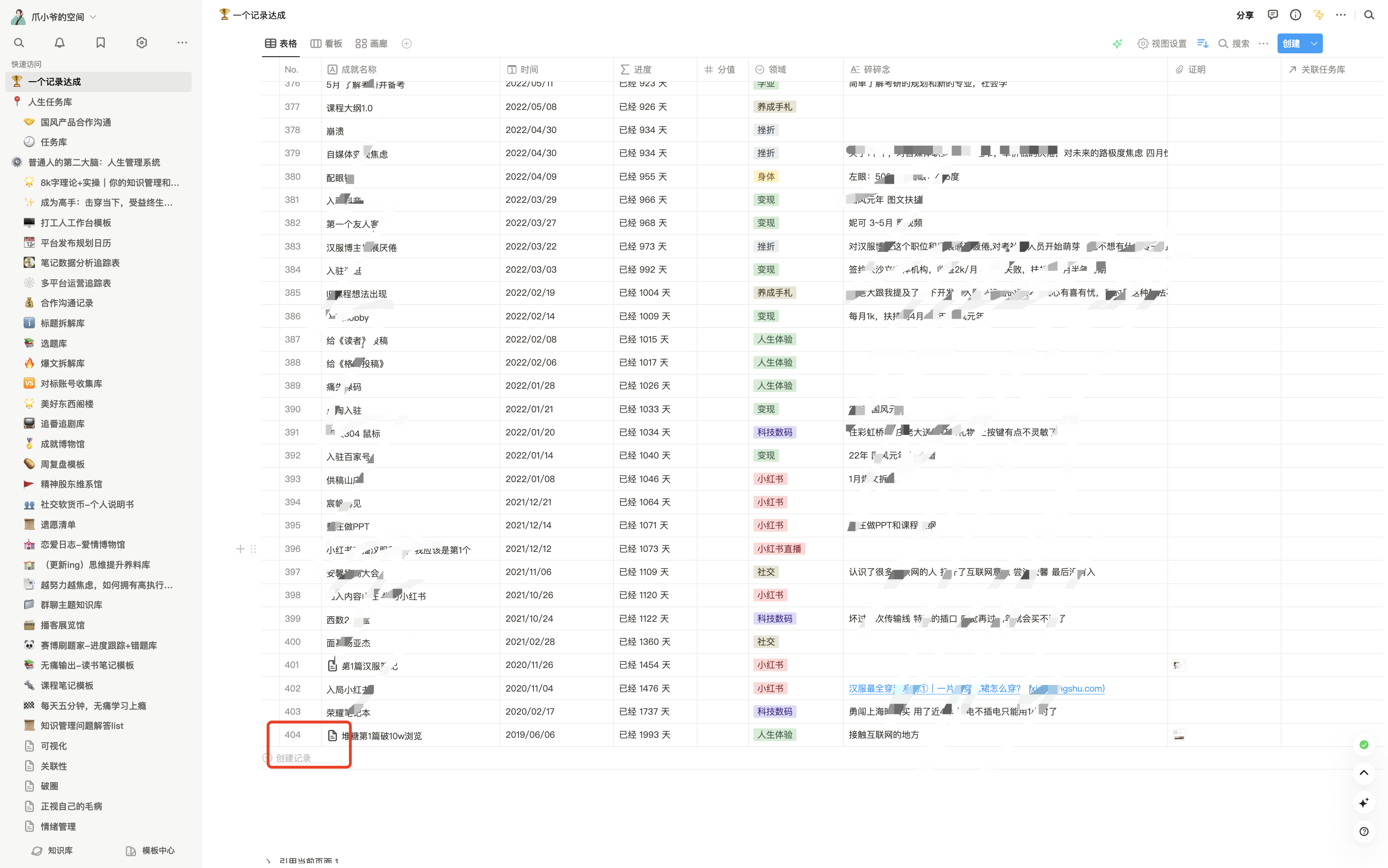 各位都知道吃掉那只青蛙,苹果要一口一口吃,要学会拆解目标这些道理,我就会记录在我的「一个记录达成库」里面。这个库目前记录了我接触互联网这几年以来,大大小小的不同领域的400多条成就