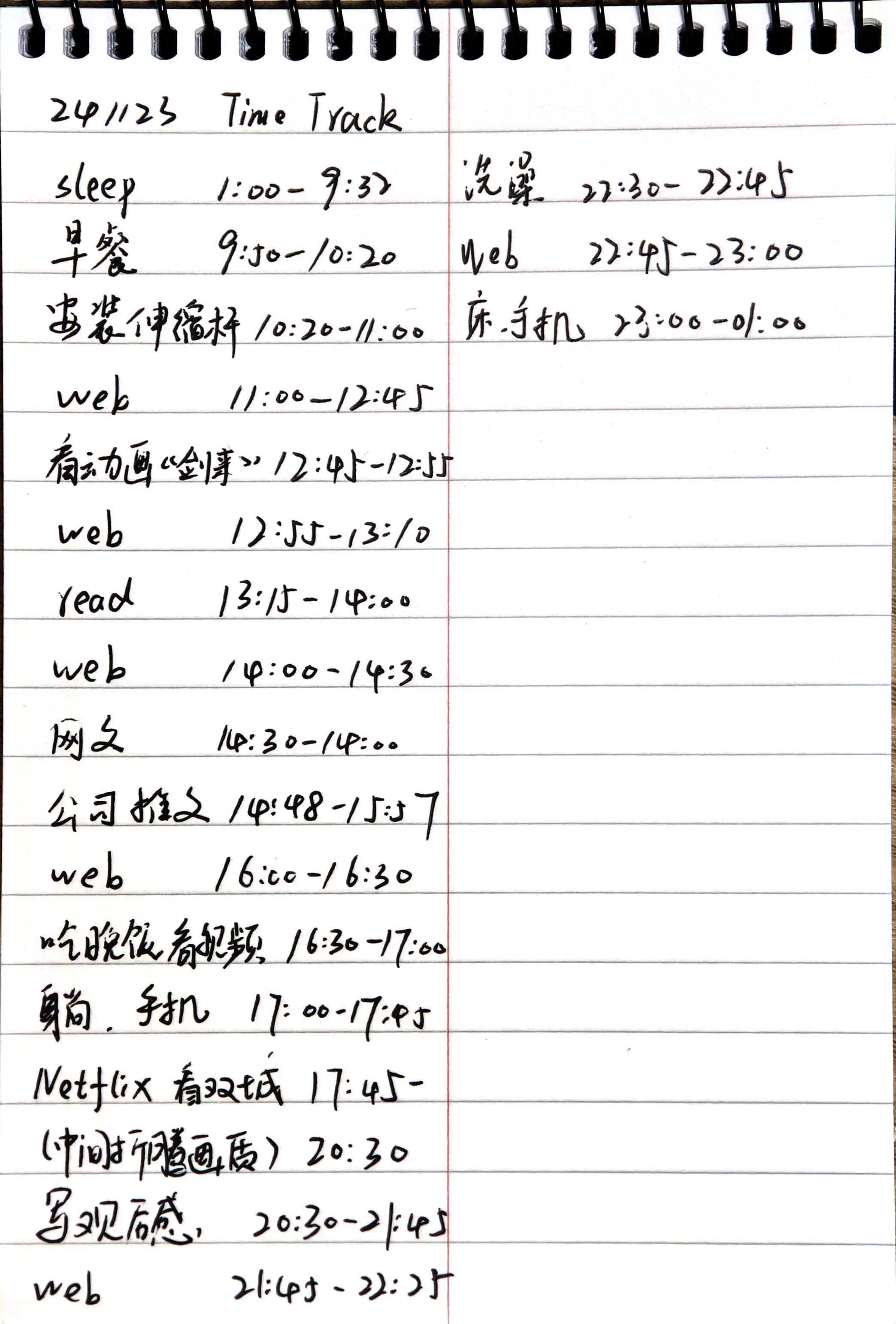 最后我想到李笑来推荐一开始记录时间,用纸笔就够了。于是周五我带着一个A6线圈本上班,间歇性记录时间(其实只需要在行动间隙记一下就行),一下子就把我从标点焦虑中解放出来。