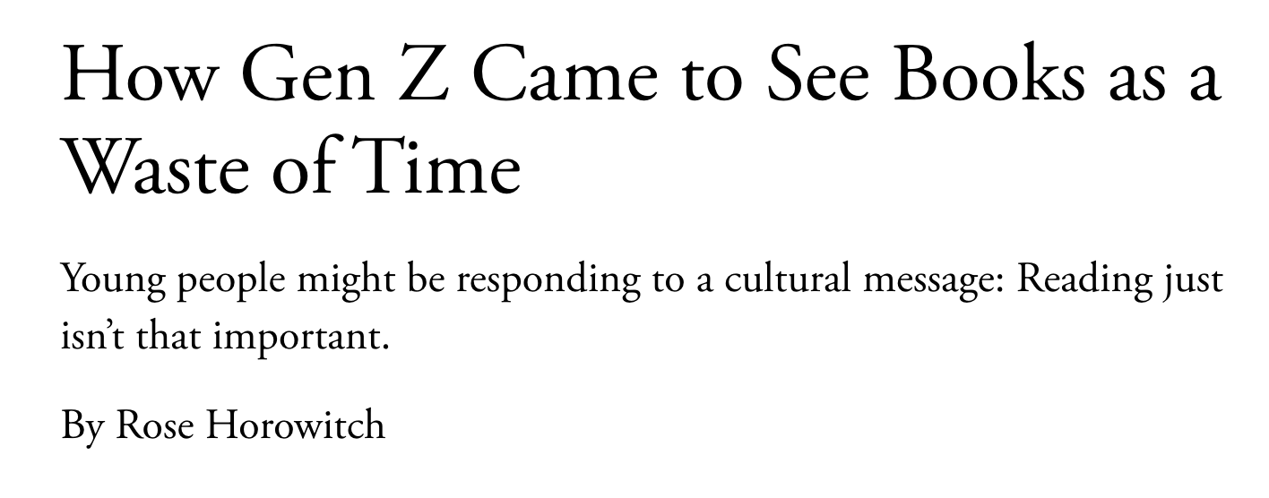 今天看到一篇 The Atlantic 的文章,标题特别吸引我《为什么 Z 世代认为看书是一种浪费时间》(How Gen Z Came to See Books as a Waste of Time)。