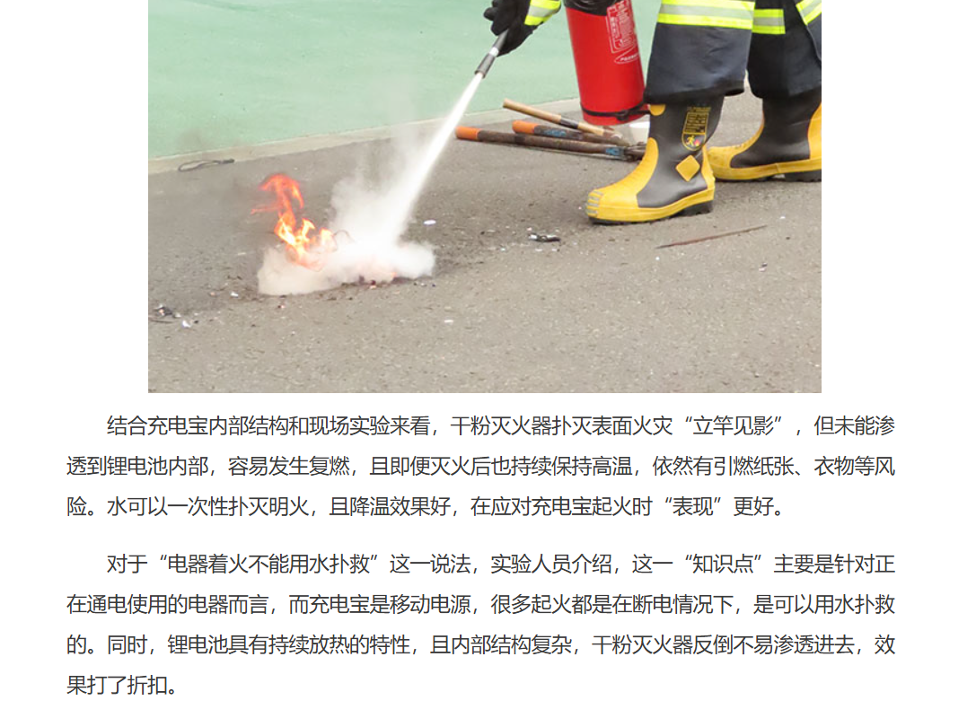 宁波的消防做过实验,对着火的充电宝分别用干粉灭火器和水尝试扑灭,干粉灭火器喷射后还会复燃,用水则可以扑灭(图8):