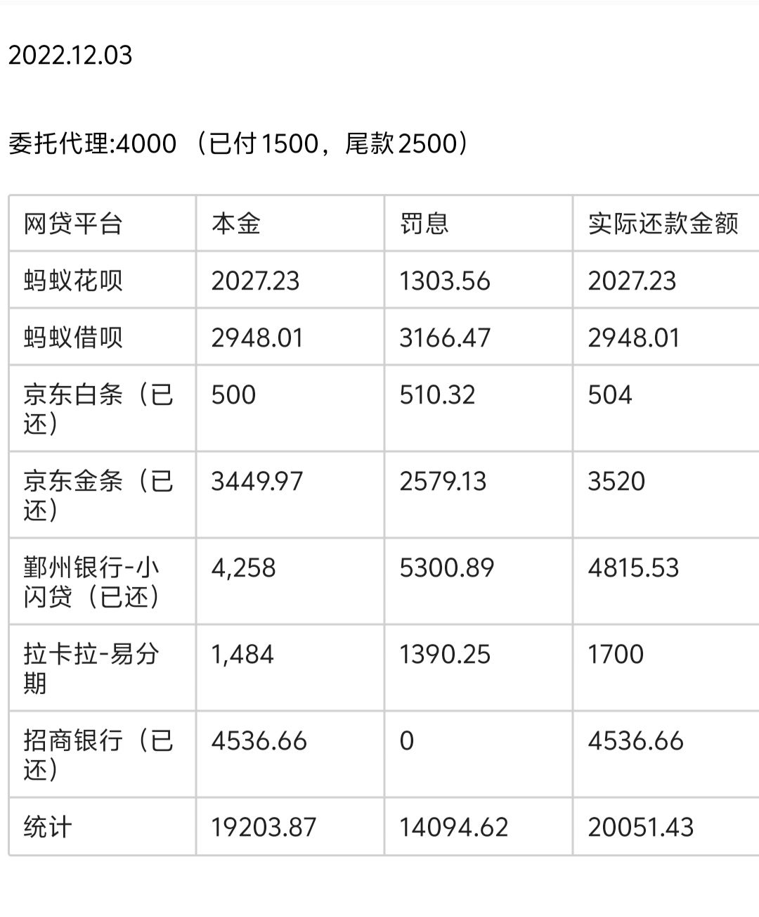 22 年 12 月,我看到了一篇文章介绍了一个委托代理处理逾期的,加了微信聊后,他们帮我处理一个平台收八百,其实他们的服务费是按本金的八个点收的,不到一万的按一万来收,但因为我每个平台的金额都不到一万,还有一个平台本金才五百,他让我自己还,我说我宁愿给你们钱,也不愿多给平台钱😕,协商下来,他们帮我处理五个平台,收我四千,预交了一千五的定金后,他们开始帮我处理白条和金条的还款金额跟支付宝花呗借呗的延期还款,还剩一个拉卡拉,我说我没钱了,要过完年才有钱,他们说没问题,到时候再联系。