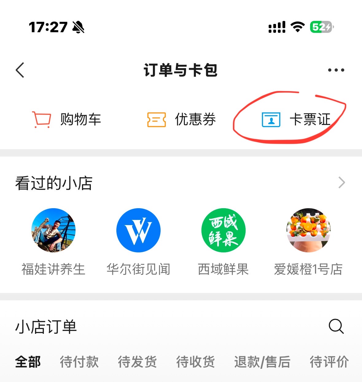微信小店订单和卡包共享一个入口了,取而代之指日可待。
