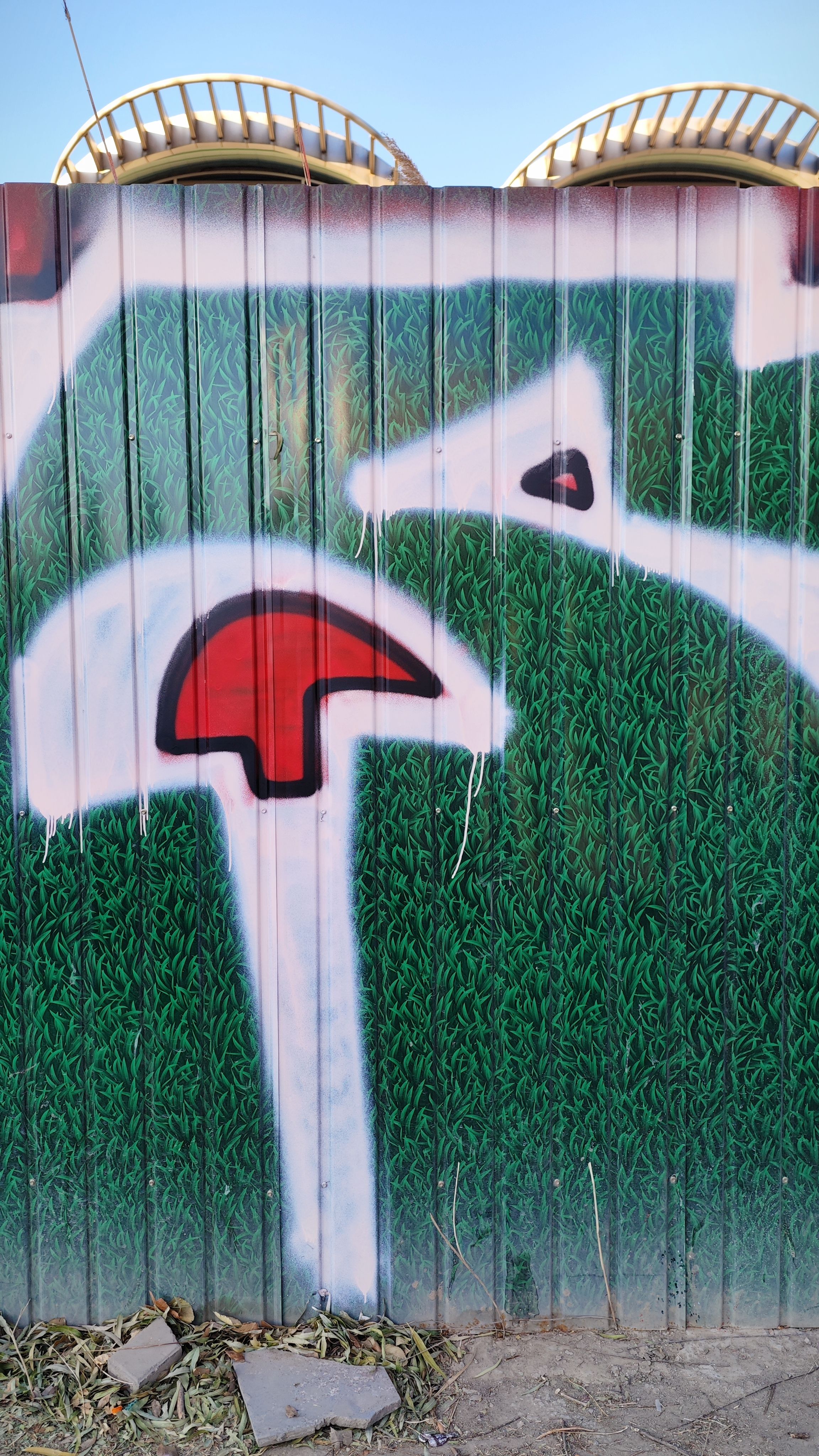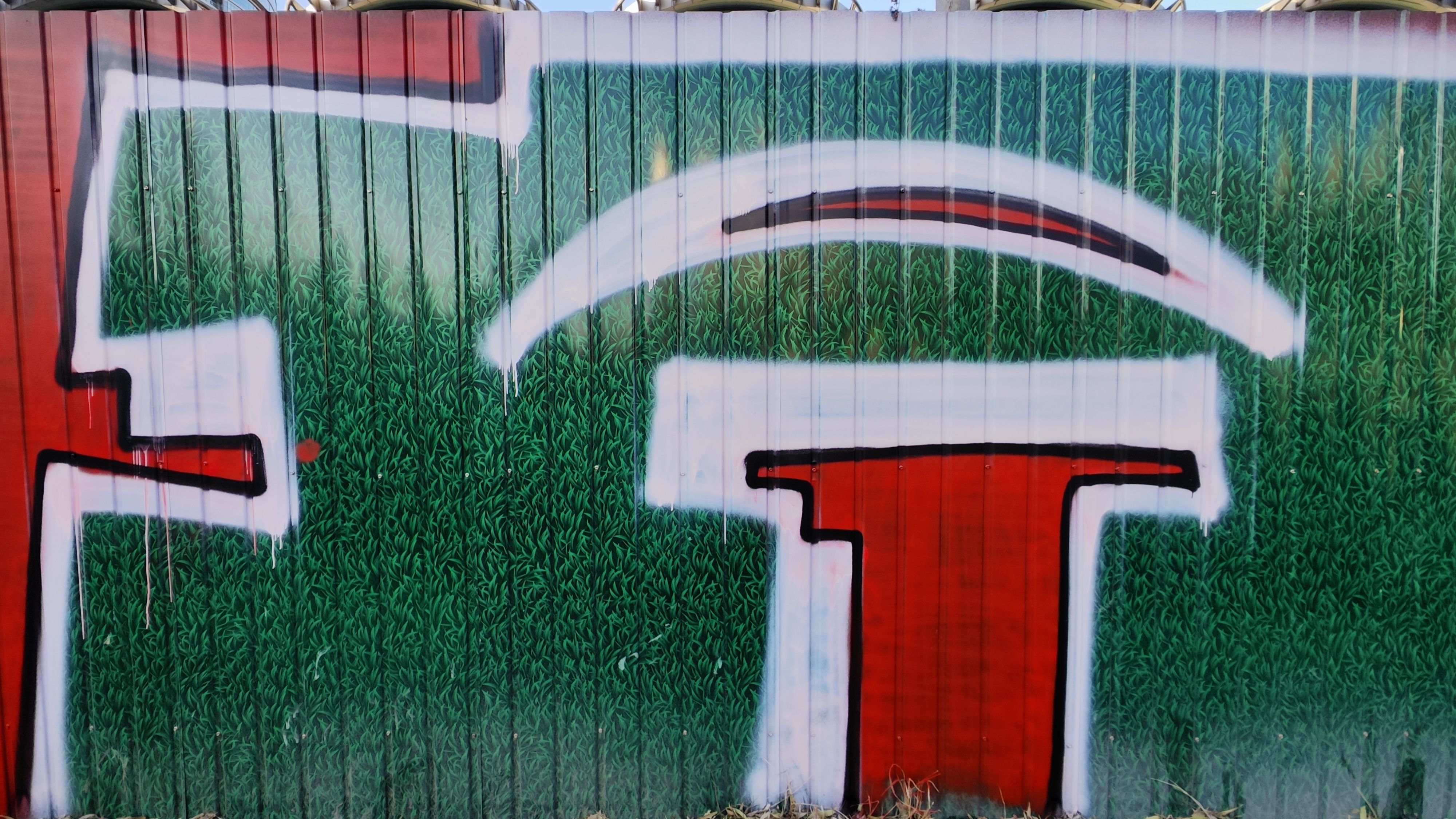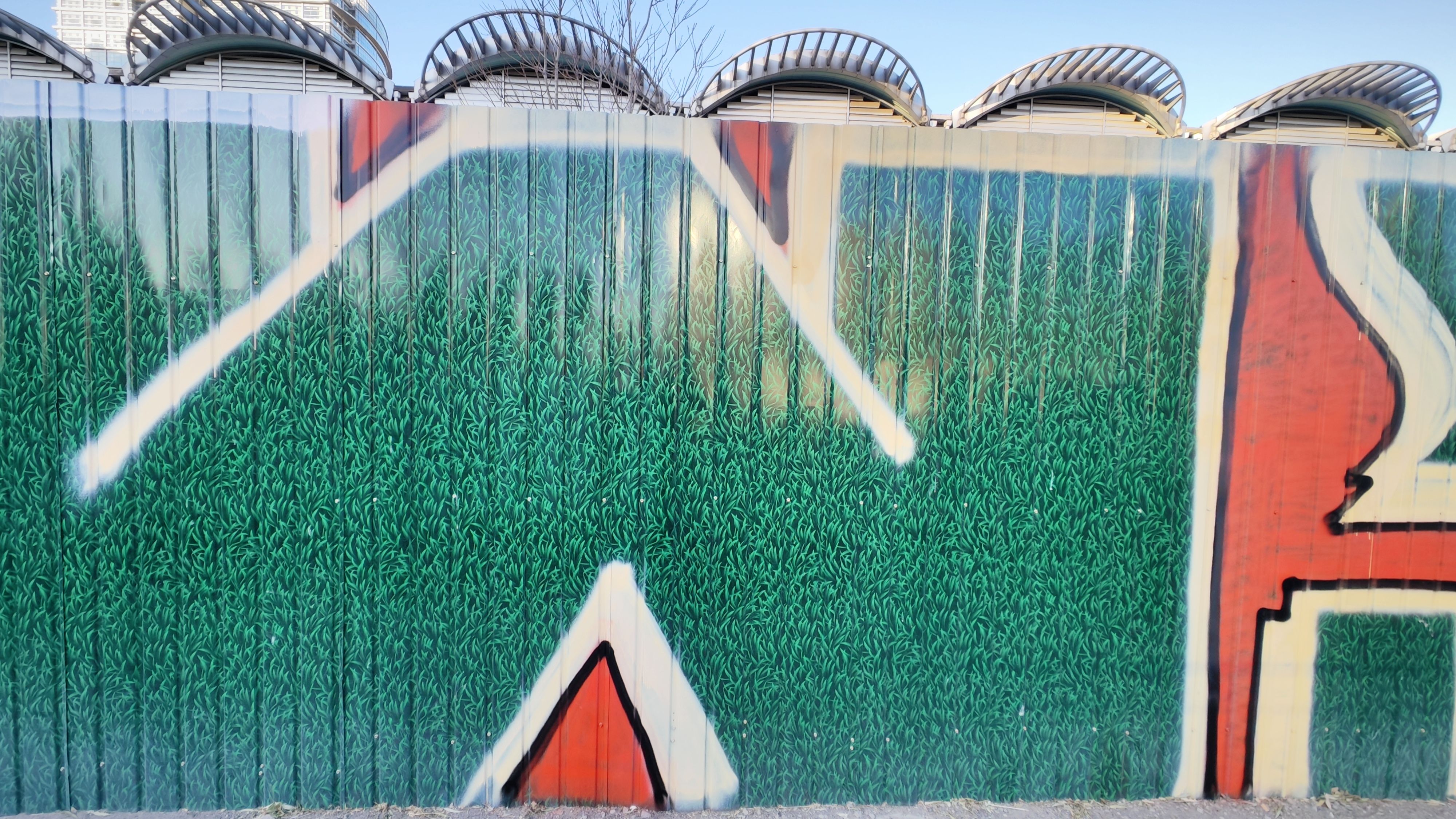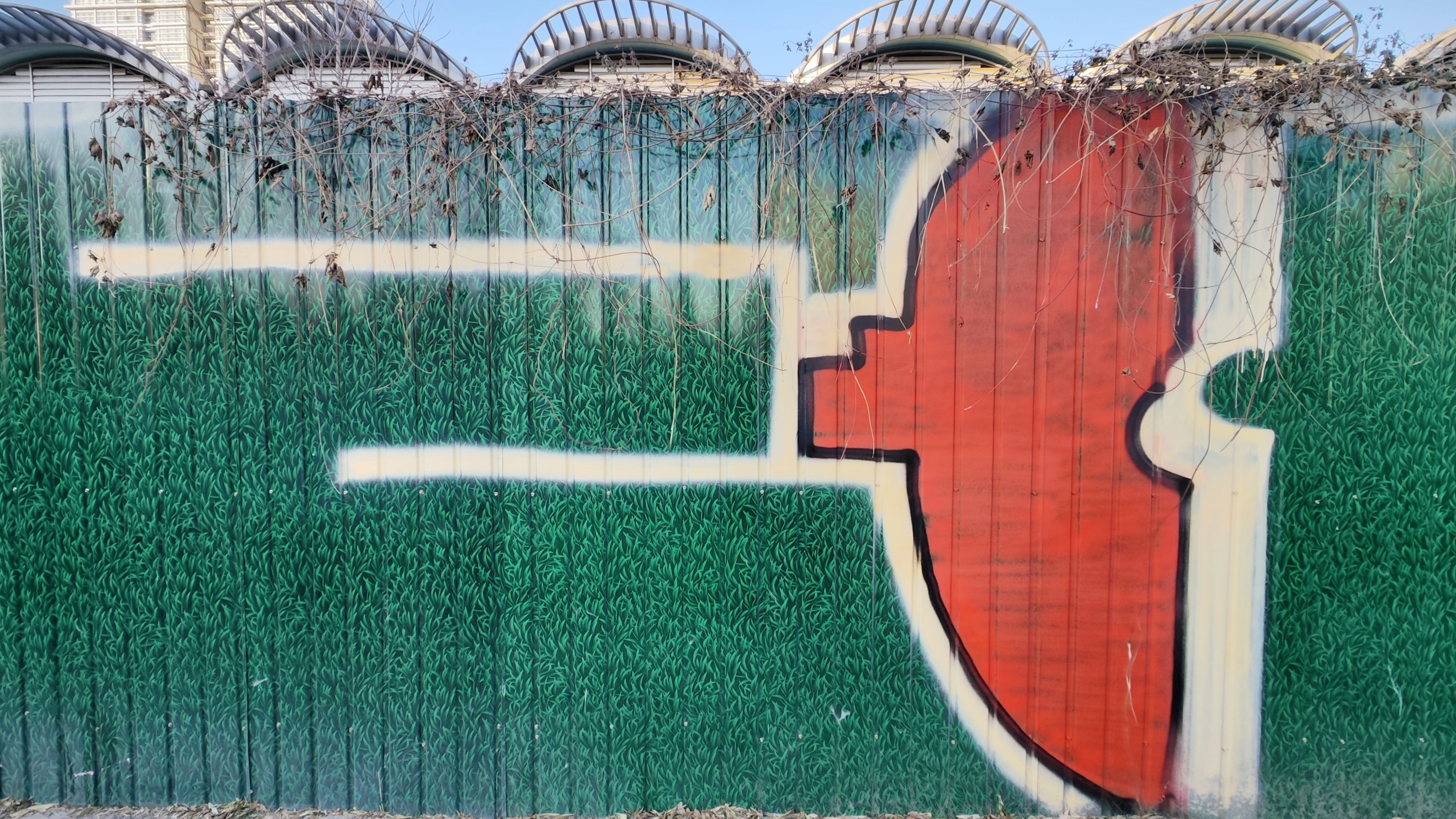 知春路地铁站这个涂鸦作品发现好长时间了 早上花点时间走上天桥来致敬一下 艺术家以深绿色的铁皮围挡作画 配以不规则的红、白色块 试图为路过此地通勤的牛马提供一些精神能量