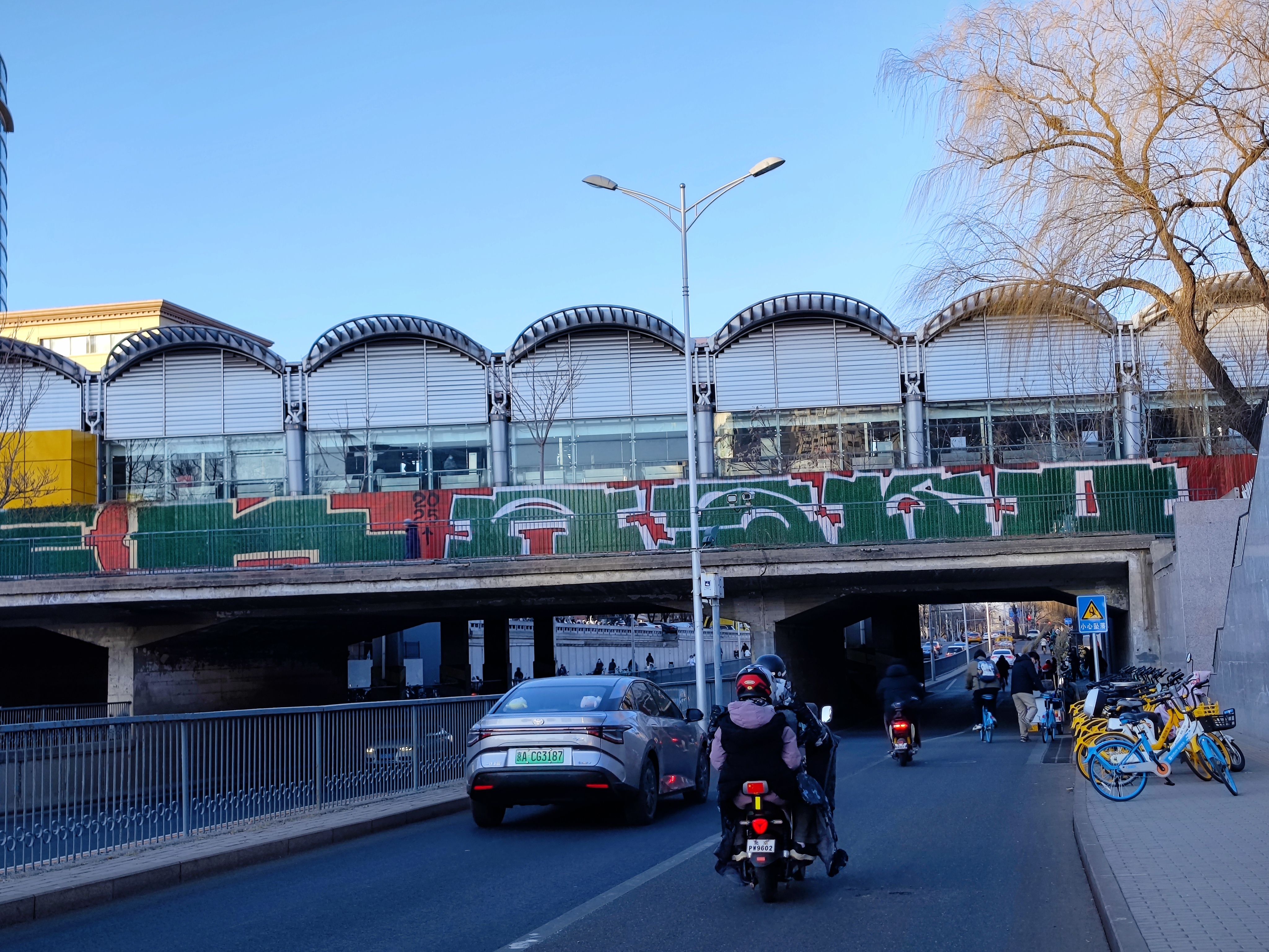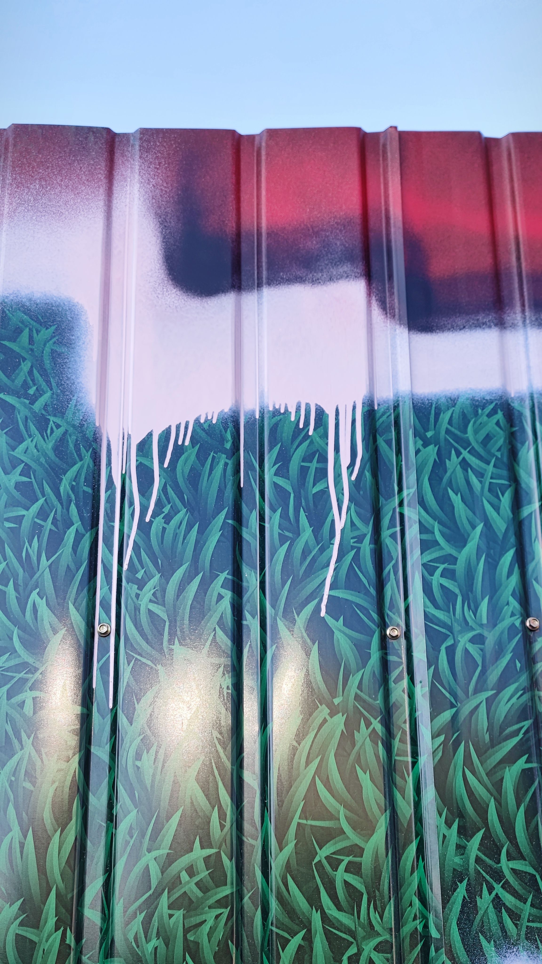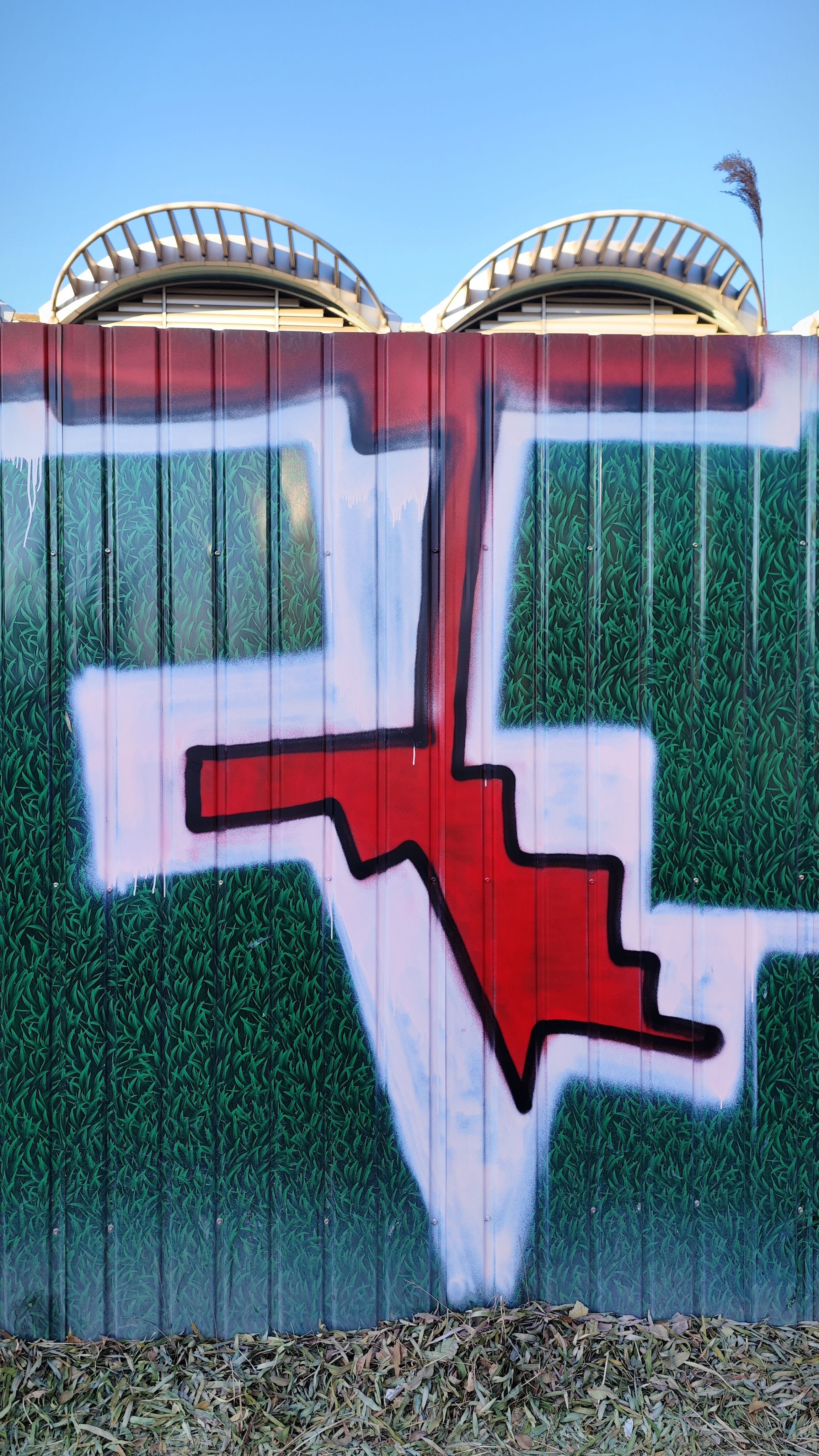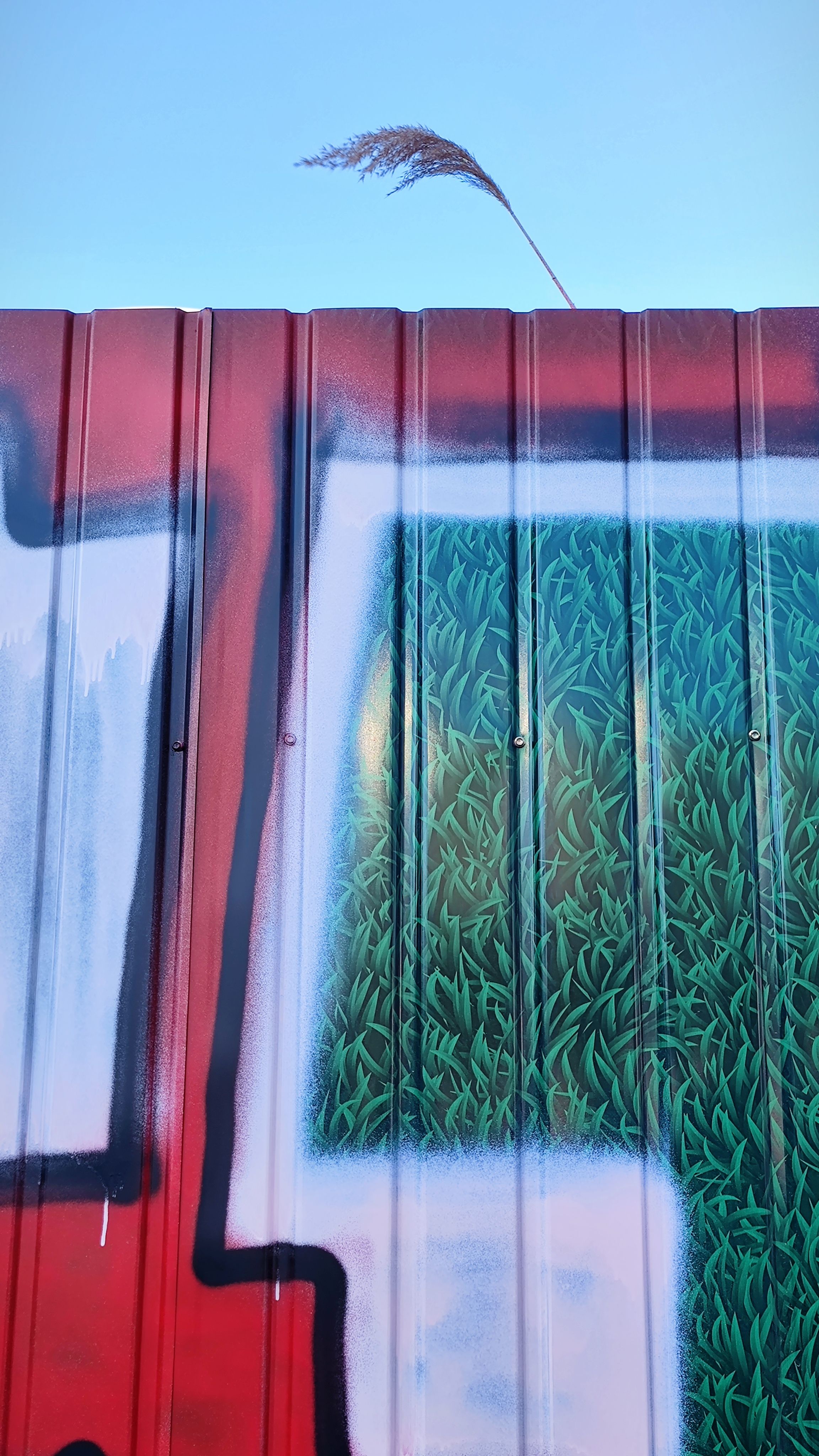 知春路地铁站这个涂鸦作品发现好长时间了 早上花点时间走上天桥来致敬一下 艺术家以深绿色的铁皮围挡作画 配以不规则的红、白色块 试图为路过此地通勤的牛马提供一些精神能量