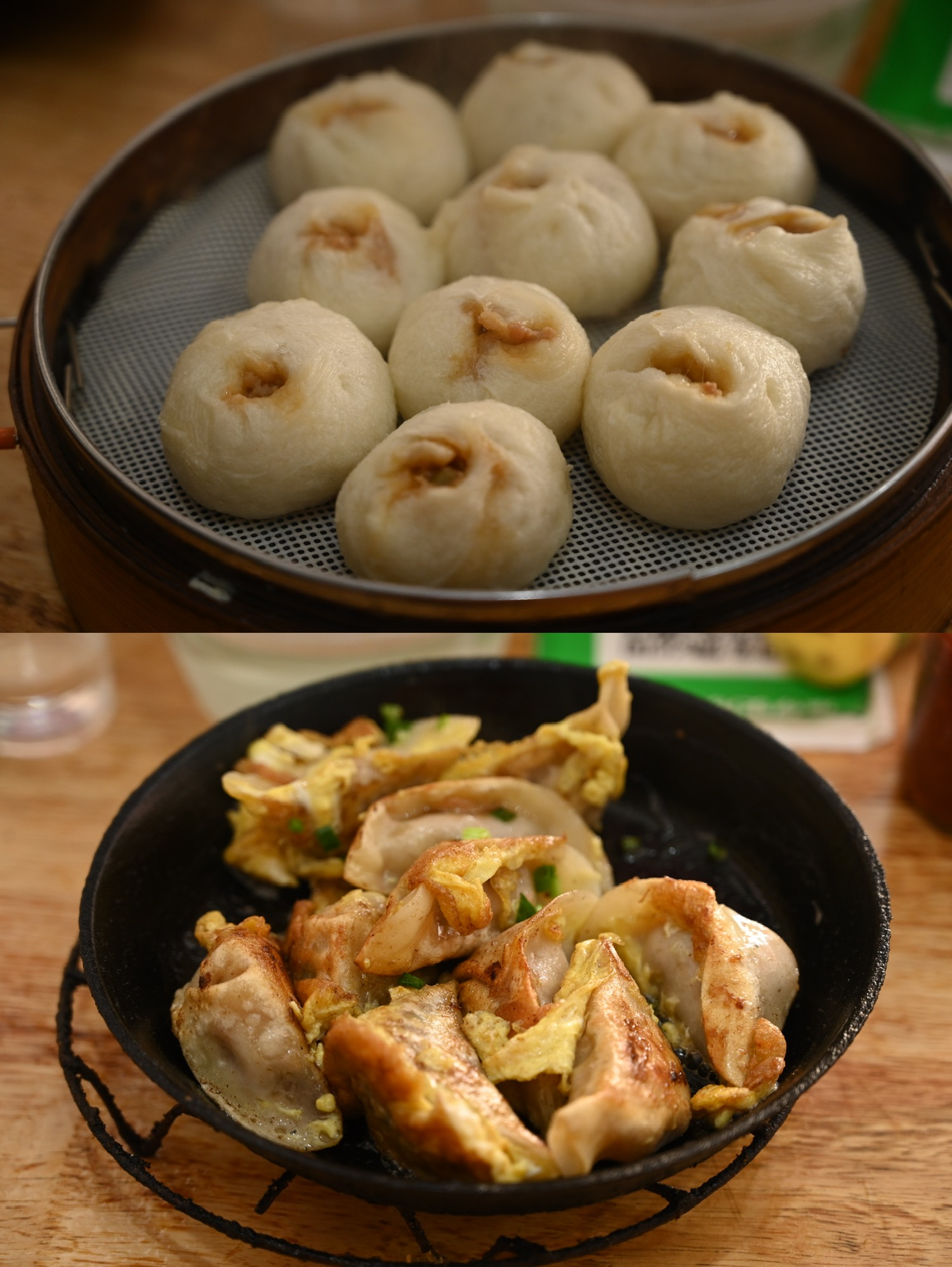所以这次专门点了发面小笼。小笼包的面皮发得很松软,包得也漂亮,没有什么褶,薄厚均匀,但肉馅又能透点油出来。吃起来不油腻也不干巴,一切都恰恰好。他家的生煎饺子会比好又来的干一些也更脆一些,更像市面上的大部分煎饺,但也是抱了蛋的那种。