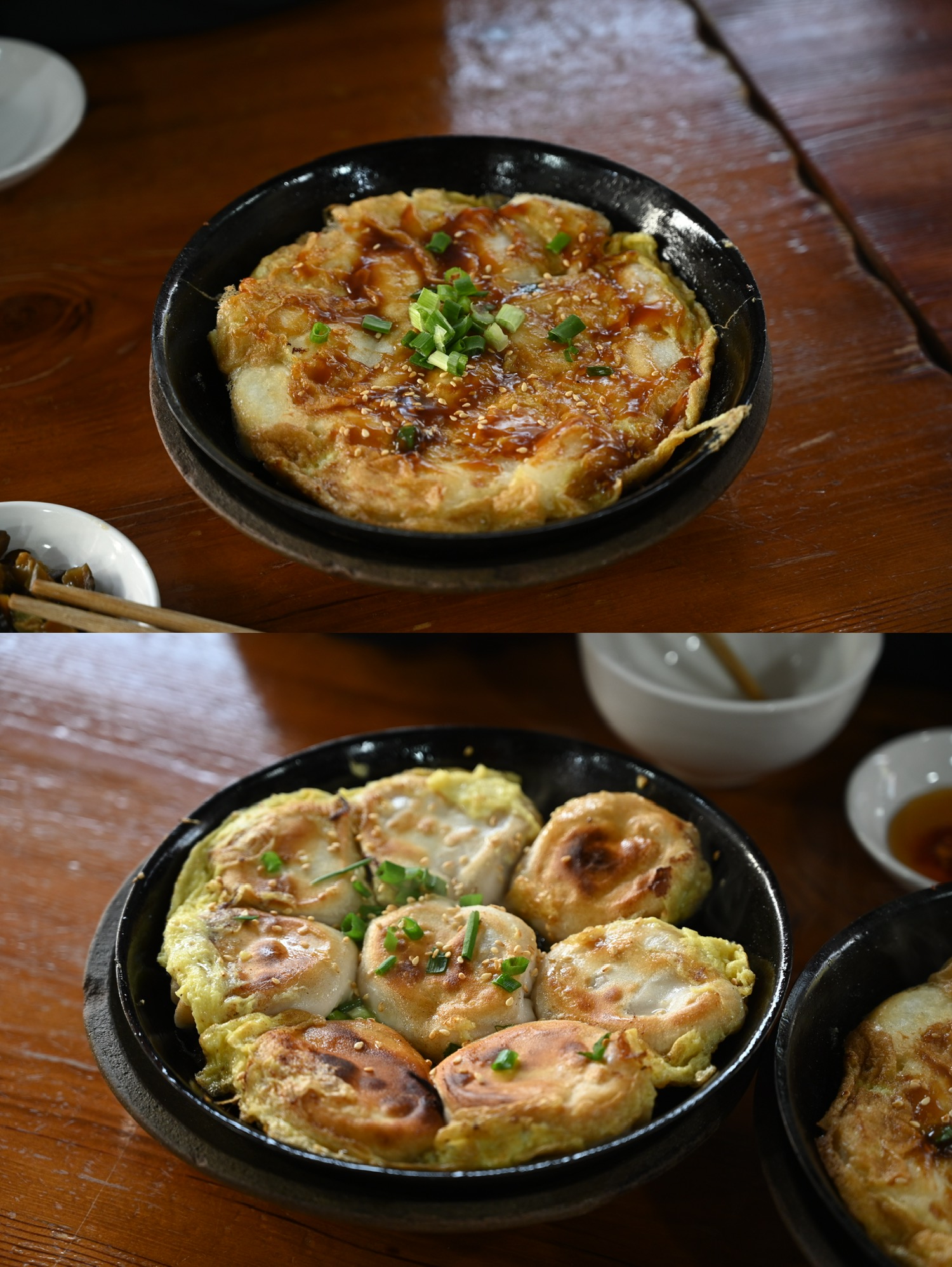 生煎豆腐包、生煎饺子、烤年糕都是他家的招牌。当地的生煎包都是薄皮的,他们称之为紧面。生煎包子饺子都是铁板现煎,最后淋上一圈鸡蛋液,所以端上来有一层蛋皮,好看又好吃。