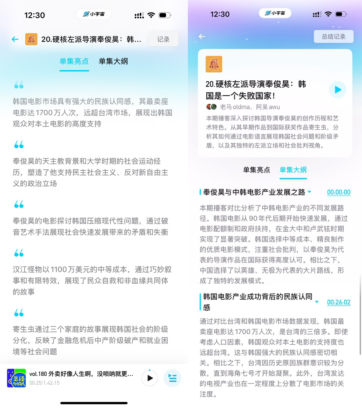 小宇宙对AI总结的推荐使用场景是「听前筛选」,每月有100次的次数限制。对《电影巨辩》这样的论文式播客,AI总结效果会比较好。目前的AI总结经过优化,已经没有早期版本的碎片感了。