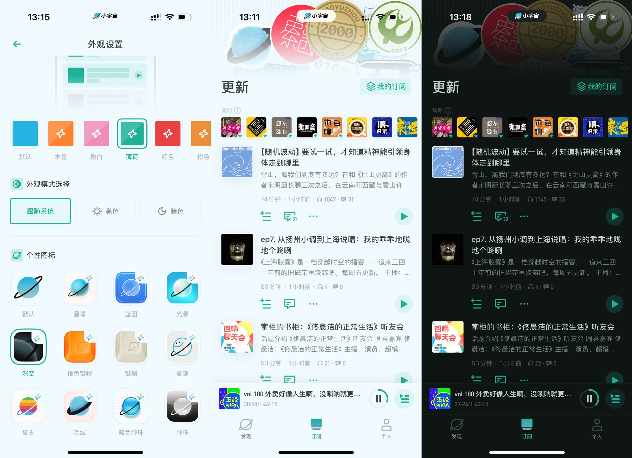 主题色不单替换了默认的小宇宙蓝,新增了7种主题色可选。无论是浅色/深色模式,界面的背景色也相应进行了调整。
