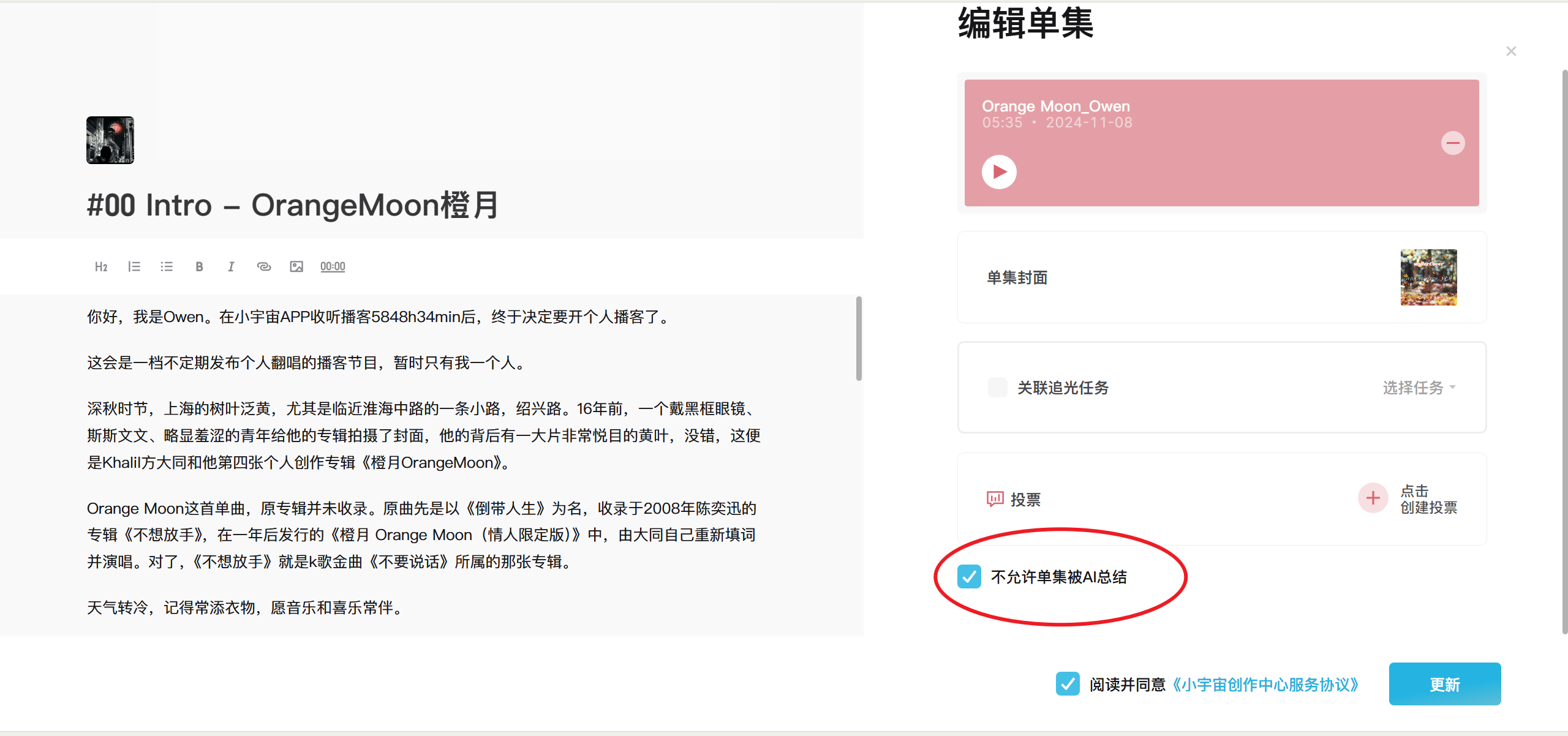 测试过程中也遇到了部分播客单集无法生成总结的情况。打开网页端的主播后台,在编辑单集的界面发现了「不允许单集被AI总结」的选项。这也就是说,不论是历史单集,还是新发布的单集,主播都可以自行选择是否支持AI总结。从这点上看,小宇宙依然是很尊重创作者的平台。