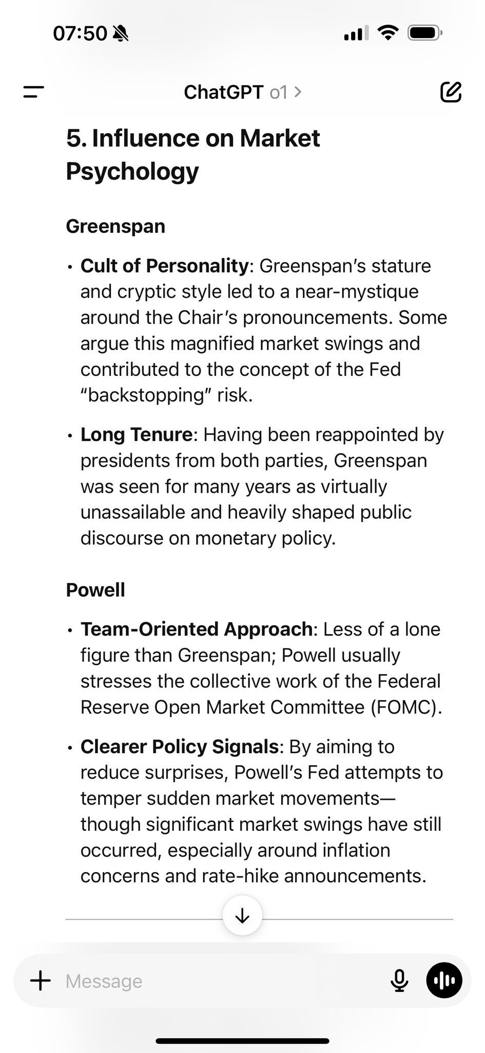 比如 o1 回答中(见截图),有一个方向是关于 Influence on Market Psychology 的,其中提到了 Greenspan 的个人魅力对市场的影响,同时 Powell 则更多依赖集体决策,倾向于给出清晰的政策信号。在 R1 中,这个点基本上没有提到。