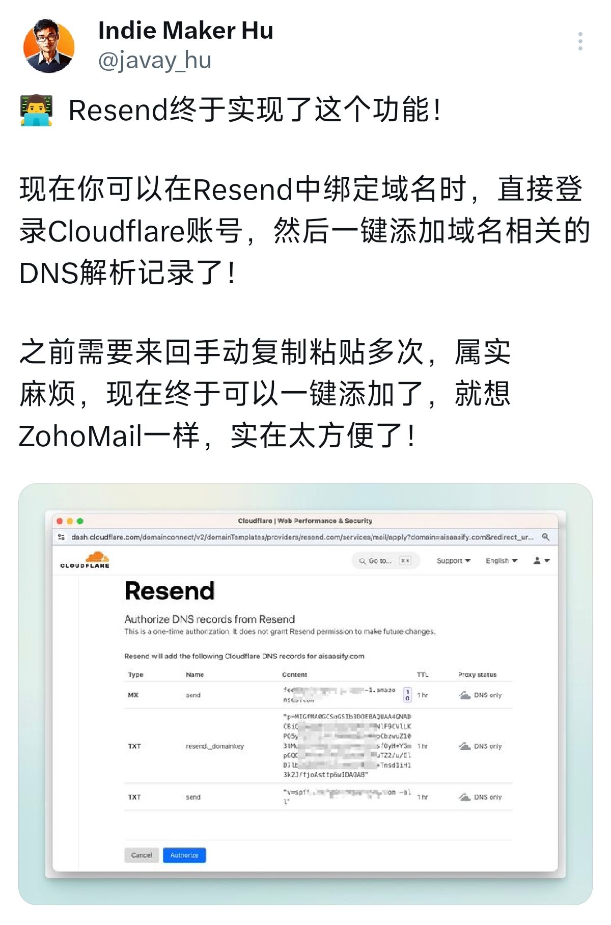 现在你可以在Resend中绑定域名时,直接登录Cloudflare账号,然后一键添加域名相关的DNS解析记录了!