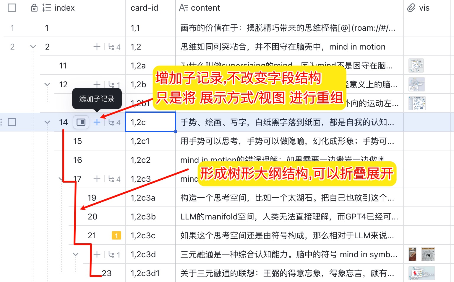 - 善用多维表格, 每一条卡片都可以是结构化多字段存储, 破除卢曼卡片只能做"文科"笔记的妄论