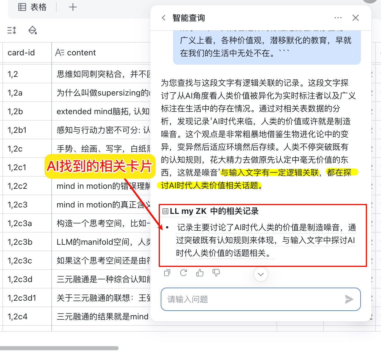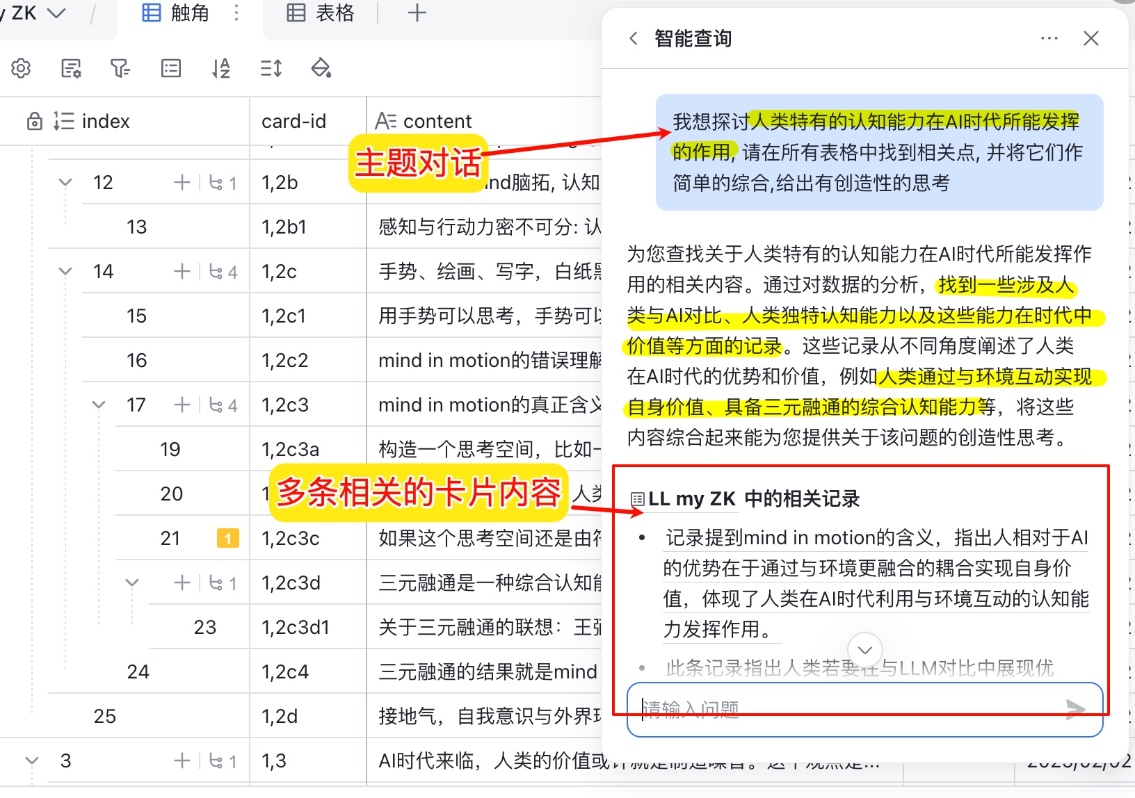 - AI对话, 给出一个主题, 在所有卡片中寻找关联点