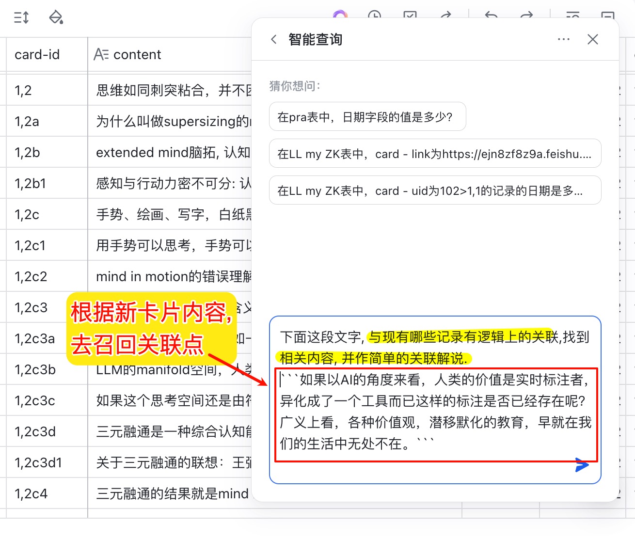 - 写了新卡后, 直接在AI对话中寻找可能的关联点