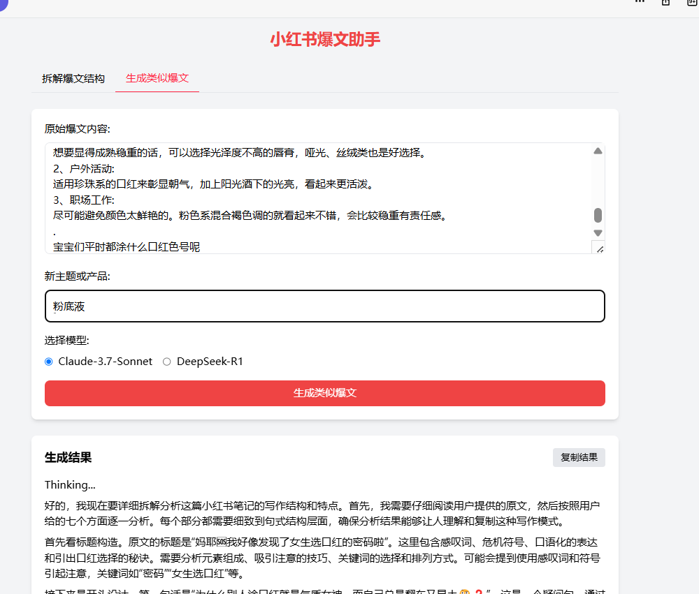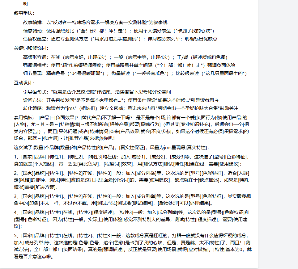 比如:我拆解的是口红小红书笔记,我就可以让它模仿粉底液的