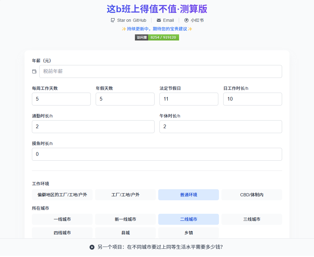 只需输入年薪、工作天数、环境等信息,它就能算出工作性价比。