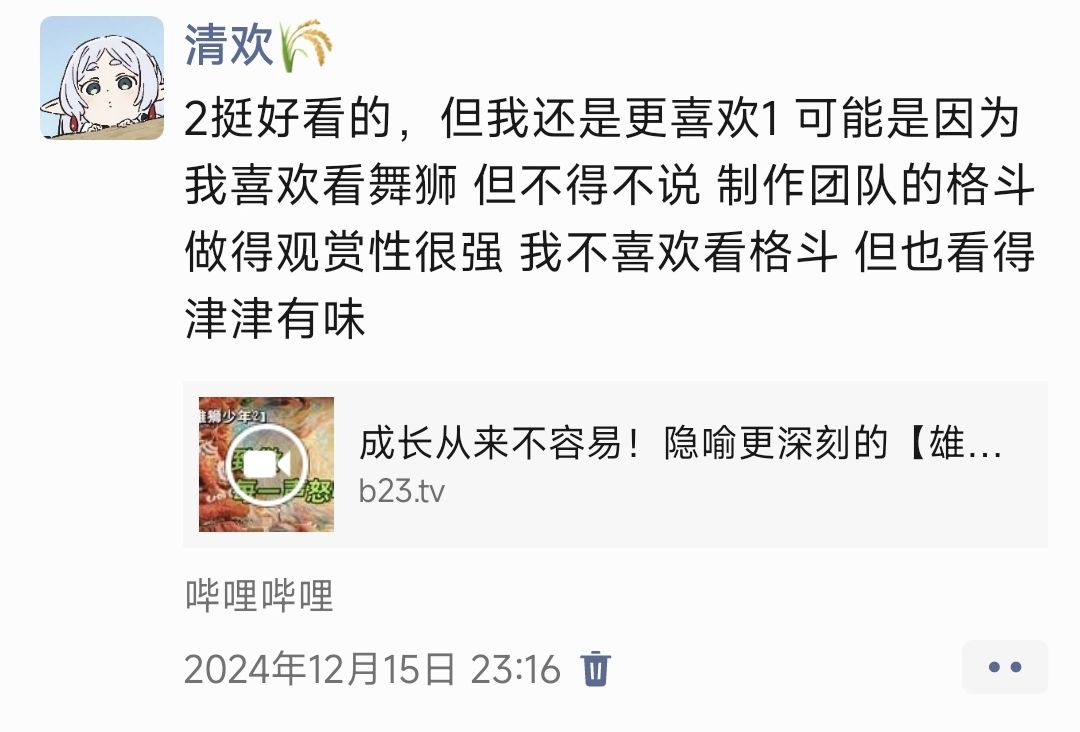 直到雄狮少年2的上映,在换题材和续集双重魔咒下,它居然能做得比1更好,主创和阿娟能在这种情况下坚持做正确的事情,戏里戏外都在践行雄狮精神,可以输但别认。所以这次我不想再沉默,我也想为这部片子做点什么,哪怕只能为他安利一个人进电影院,扭转一个人对他的印象,或者说让主创和同样喜欢片子的人知道有人喜欢这个片子,我也要做点什么,它的质量值得我为它发声,那就去做正确的事情,哪怕得不到认可。