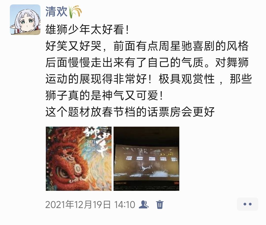 票房不好又怎么样呢,这部片子的质量有目共睹有口皆碑,甚至有三年前的黑子黑转粉,等到沉冤昭雪的那天我可以很自豪地说我可是原始粉,雄狮少年3也立项了(起码文件夹已经建好了[破涕为笑]),那就雄狮少年3再见吧!要在生活中继续努力呀