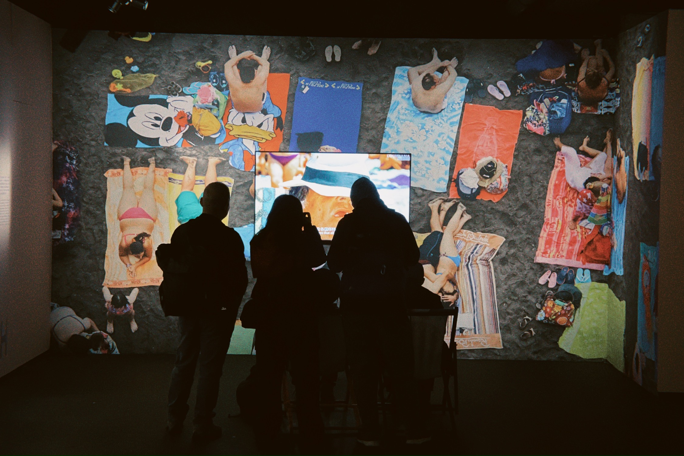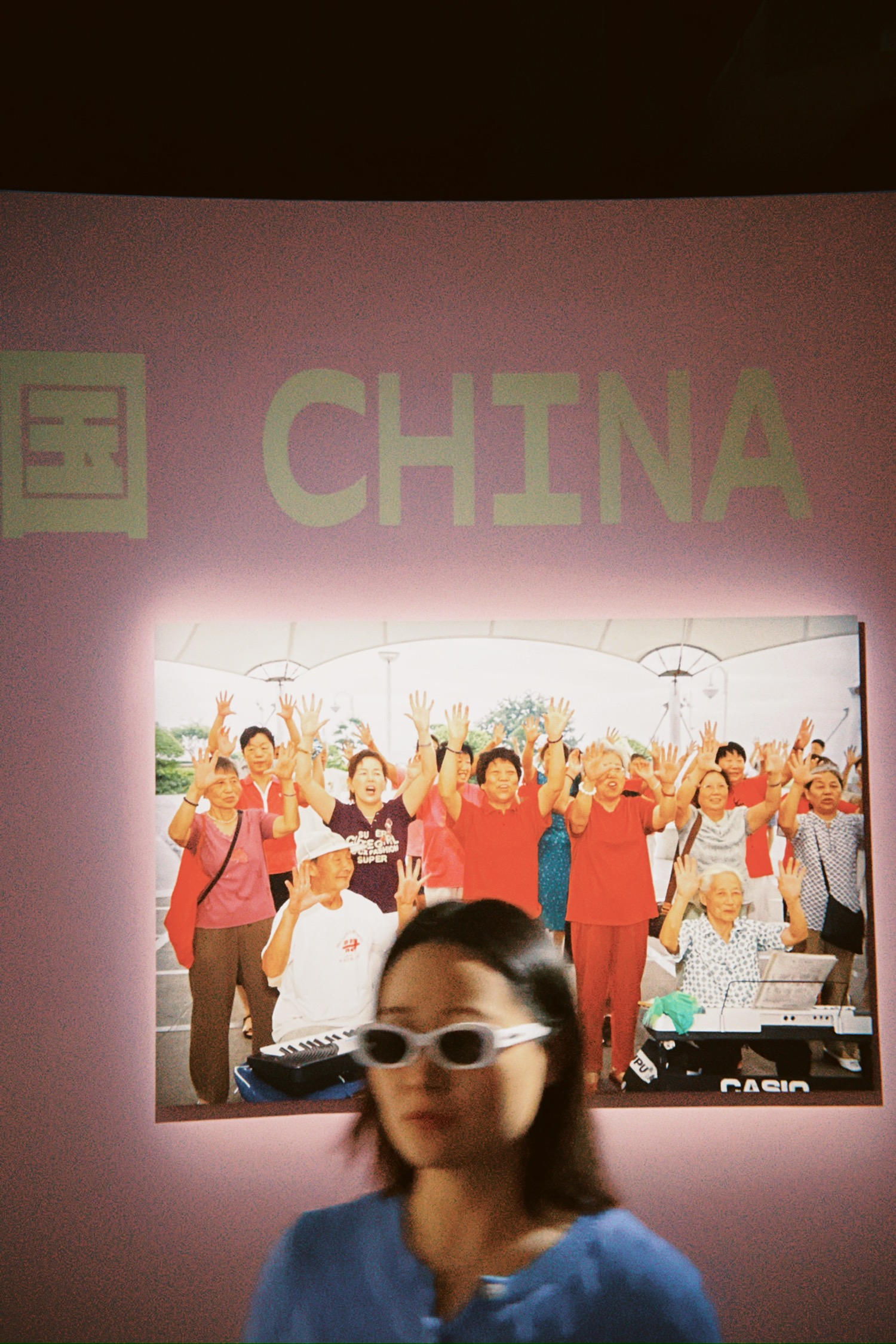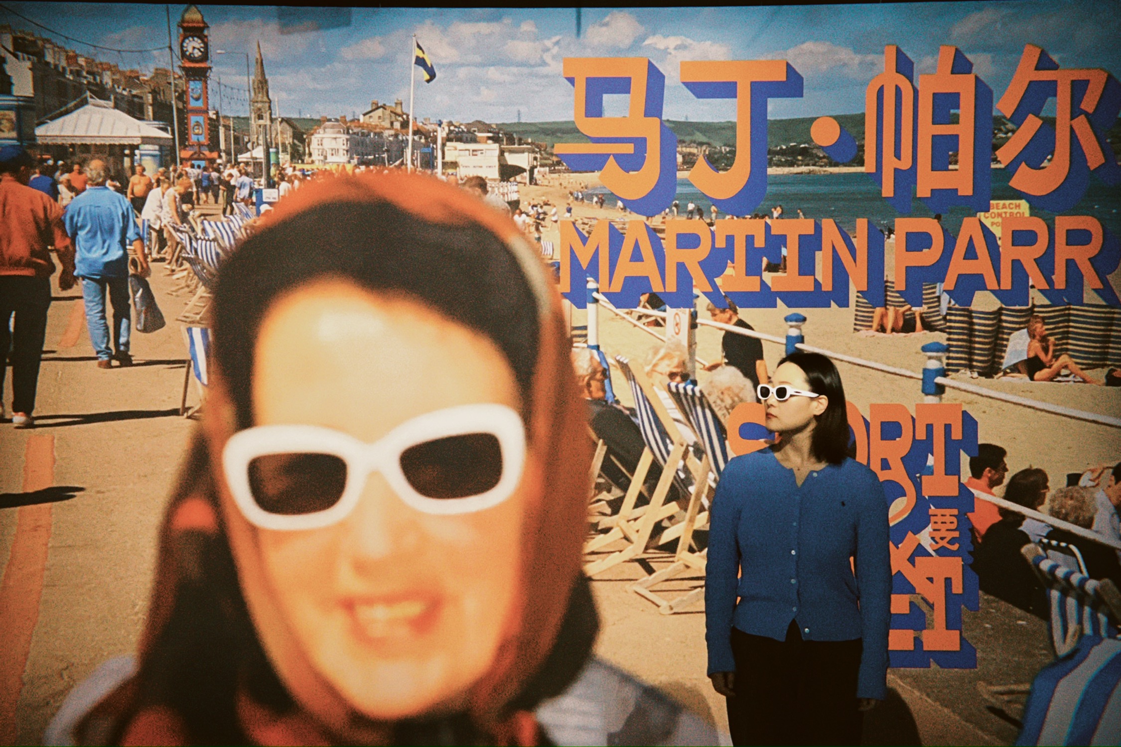 看展前前台小姐姐给了每人一副白色边框的墨镜,鼓励观众参与趣味拍照互动。这个浓浓度假风海滩风的眼镜在展厅里带多少有点浮夸,可能这就是要的效果吧,一种反差与讽刺融入展览之中。